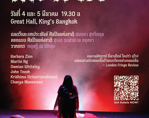 MAE NAAK: THE CLASSIC OPERAบทประพันธ์โดย สมเถา สุจริตกุล วันที่: 4–5 มีนาคม | เวลา: 19:30 น.สถานที่: ณ Great Hall, โรงเรียนนานาชาติคิงส์คอลเลจ กรุงเทพฯ นำแสดงโดย:…