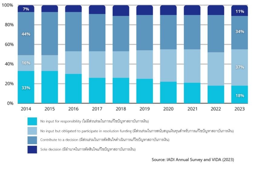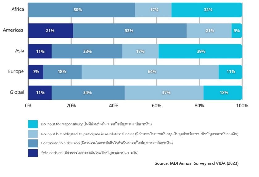 โดย IADI คาดว่าปัจจัยที่ส่งผลต่อแนวโน้มดังกล่าวเกิดจากการที่หน่วยงานประกันเงินฝากในภูมิภาคยุโรปต้องดำเนินการตามกฎหมาย Bank Recovery and Resolution Directive (BRRD) ที่ระบุข้อบังคับให้หน่วยงานประกันเงินฝากในยุโรปต้องมีส่วนร่วมในการเป็นแหล่งเงินทุนสนับสนุนการบริหารจัดการสถาบันการเงินที่ประสบปัญหา สอดคล้องกับข้อมูลของ IADI ณ ปี 2566 ที่พบว่าหน่วยงานประกันเงินฝากในภูมิภาคยุโรปมีสัดส่วนของหน่วยงานที่มีส่วนร่วมในการสนับสนุนเงินทุนสำหรับการแก้ไขปัญหาสถาบันการเงินสูงที่สุดเมื่อเทียบกับภูมิภาคอื่นที่ร้อยละ 64 ขณะที่ในภูมิภาคแอฟริกา หน่วยงานประกันเงินฝากส่วนใหญ่มีส่วนร่วมในการตัดสินใจดำเนินการแก้ไขปัญหาสถาบันการเงิน สำหรับภูมิภาคเอเชียพบว่า มีสัดส่วนของหน่วยงานที่ไม่มีส่วนร่วมในการแก้ไขปัญหาสถาบันการเงิน (ทำหน้าที่เฉพาะจ่ายคืนผู้ฝากเมื่อสถาบันการเงินถูกเพิกถอนใบอนุญาต) สูงที่สุดที่ร้อยละ 39