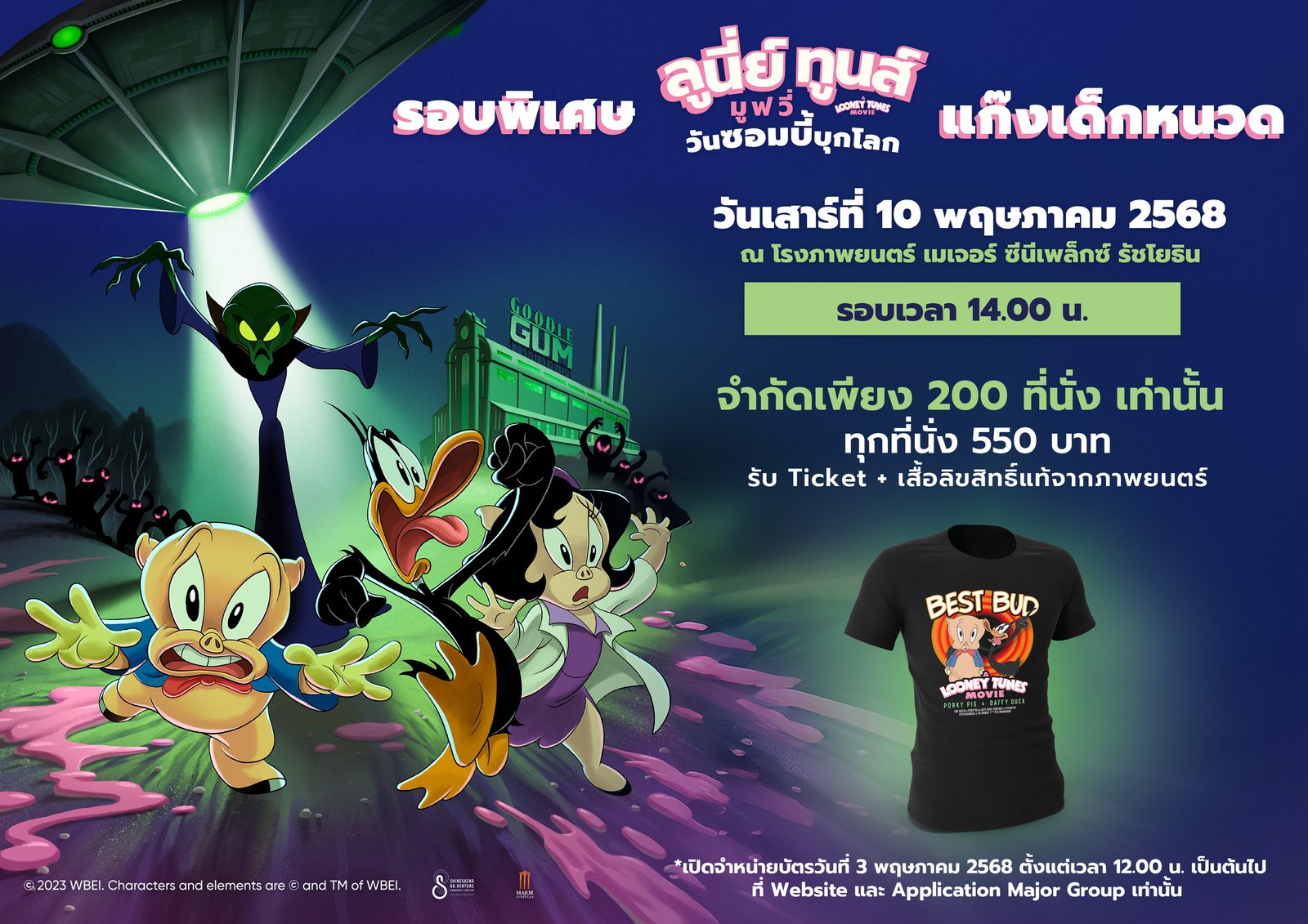 การผจญภัยสุดฮากับ Looney Tunes กำลังรอคุณอยู่! จองที่นั่งใน รอบพิเศษ กับการชมภาพยนตร์สุดป่วนที่คุณจะไม่มีวันลืม รับ Ticket + เสื้อลิขสิทธิ์แท้จากภาพยนตร์ Looney Tunes Movie ที่มีแค่ในงานนี้เท่านั้น! (ไซซ์ให้เลือกหน้างาน)