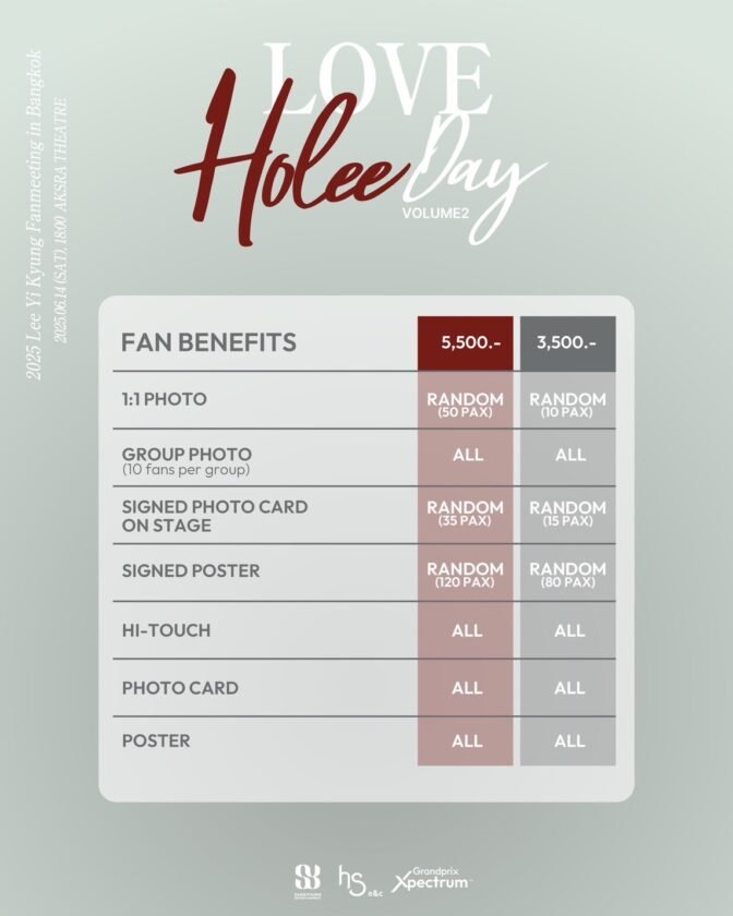 ใครที่ตกหลุมรักอยู่แล้วหรือเพิ่งตกหลุมรัก “อีอีคยอง” จากฝีมือการแสดงหลากหลายบทบาทในซีรีส์ อาทิ ‘Marry My Husband’ , ‘My Dearest‘ , ‘Curtain Call’ , ‘ Royal Secret Agent’ ฯลฯ หรือจะตกหลุมรักตัวตนของเขาจากไลฟ์สไตล์นอกจอ เตรียมพาตัว และหัวใจมาสัมผัสตัวจริงเสียงจริง และเติมเต็มช่วงเวลาที่ดีที่สุดไปกับเขาคนนี้ที่อาจจะมีเซอร์ไพรส์มาให้แบบไม่ทันตั้งตัว เพราะแค่ออเดิร์ฟแรกกับเบเนฟิตก็ดีต่อใจไม่ไหวแล้ว!! งาน LEE YI KYUNG FANMEETING IN BANGKOK <LOVE HOLEE DAY VOLUME 2> เปิดจำหน่ายบัตรวันจันทร์ที่ 5 พฤษภาคม 2568 ตั้งแต่เวลา 12.00 น. เป็นต้นไป ผ่านทาง www.zipeventapp.com บัตรราคา 5,500 และ 3,500 บาท