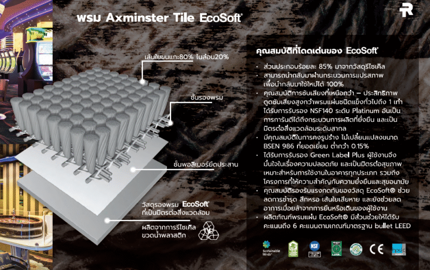 Royal Thai คือผู้นำด้านการออกแบบ ผลิต และจัดจำหน่ายวัสดุปูพื้นมากว่า 50 ปี ตอบโจทย์การใช้งานและความสวยงามควบคู่ไปกับความยั่งยืน ภายใต้การบริหารของบริษัท ทีซีเอ็ม คอร์ปอเรชั่น จำกัด (มหาชน) บริษัทได้เริ่มแนวคิดในการรวมความยั่งยืนด้านสิ่งแวดล้อมเข้ากับการพัฒนาผลิตภัณฑ์ตั้งแต่เมื่อ 18 ปีที่แล้ว โดยการคิดค้นนวัตกรรมแผ่นรองพรม EcoSoft® ที่เป็นมิตรต่อสิ่งแวดล้อม ผลิตจากขวดน้ำดื่มพลาสติกใช้แล้วซึ่งเป็นแหล่งขยะจำนวนมหาศาลในแต่ละวัน โดยขยะเหล่านี้ได้ถูกนำมาใช้เป็นวัตถุดิบในการผลิตพรม EcoSoft® ทุกๆ 1 ตารางเมตรของพรม EcoSoft® ทำจากขวดน้ำดื่มพลาสติก PET ขนาด 550 มล. จำนวน 50 ขวดเราจะมุ่งมั่นพัฒนาสร้างสรรค์ผลิตภัณฑ์และนวัตกรรมใหม่ เพื่อมุ่งสู่การเป็นผู้ผลิตสินค้าที่เป็นมิตรต่อสิ่งแวดล้อม และมุ่งมั่นพัฒนาองค์กรให้ก้าวสู่ Net Zero ในปี 2050 ต่อไป