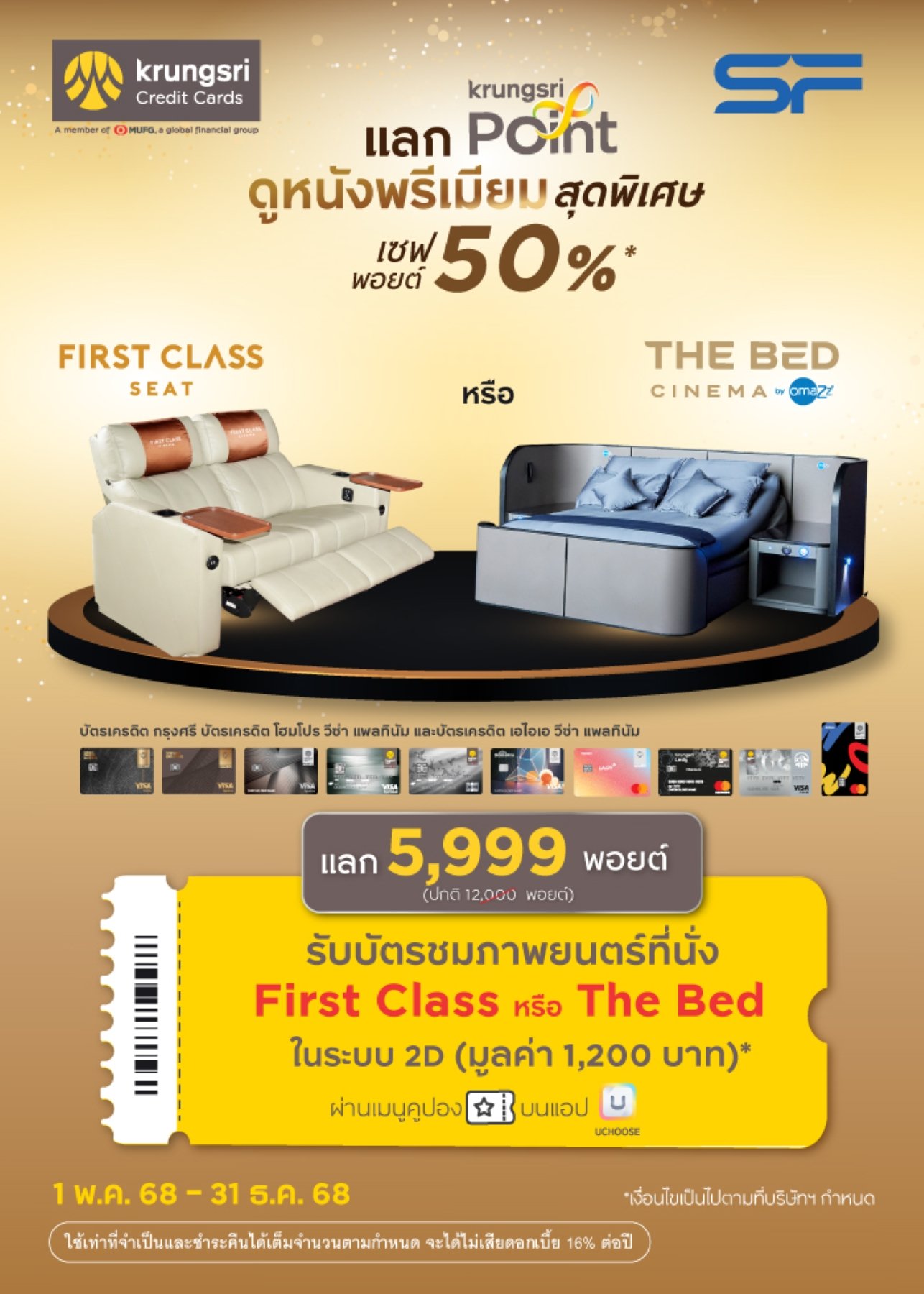 บริษัท เอสเอฟ คอร์ปอเรชั่น จำกัด (มหาชน) ร่วมกับ บริษัท บัตรกรุงศรีอยุธยา จำกัด จัดแคมเปญพิเศษมอบสิทธิ์สุดคุ้มให้กับลูกค้าโรงภาพยนตร์ในเครือ เอส เอฟ และ บัตรเครดิต กรุงศรี สามารถใช้กรุงศรี พอยต์ 5,999 พอยต์ แลกรับบัตรชมภาพยนตร์ ที่นั่ง First Class หรือที่นั่งโรงภาพยนตร์ THE BED CINEMA by Omazz® (ในระบบปกติ) จำนวน 1 ที่นั่ง โดยสามารถทำรายการผ่านแอปพลิเคชัน UCHOOSE และ นำ E-Coupon มายืนยันเพื่อรับสิทธิ์และเลือกที่นั่ง ณ จุดจำหน่ายบัตรชมภาพยนตร์ ที่โรงภาพยนตร์ในเครือ เอส เอฟ สาขาที่ร่วมรายการ ตั้งแต่วันนี้เป็นต้นไปจนถึงวันที่ 31 ธันวาคม 2568