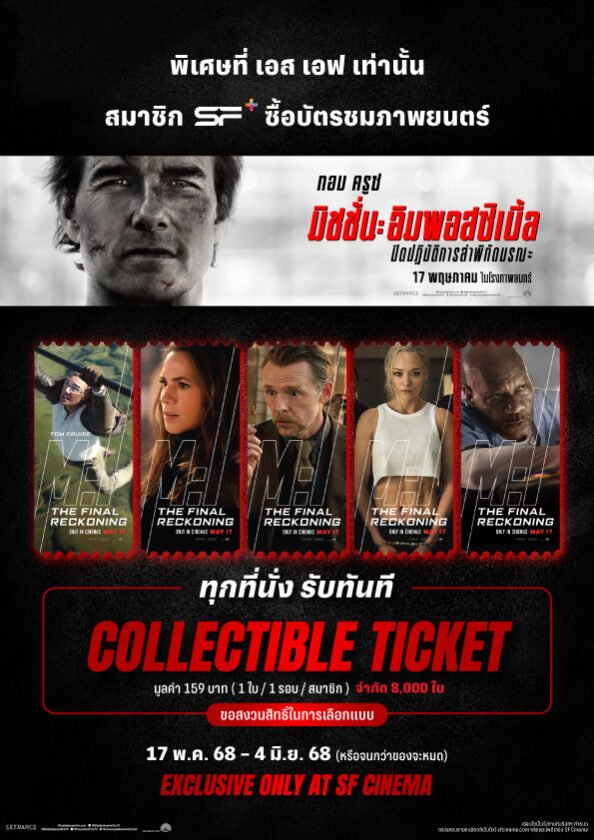 - สมาชิก SF+ ที่ซื้อบัตรชมภาพยนตร์ “Mission: Impossible – The Final Reckoning” ทุกที่นั่งรับทันที SF+ Collectible Ticket ลิขสิทธิ์แท้จากภาพยนตร์ ( 1 ใบ / 1 รอบ / 1 สมาชิก ) มี 5 แบบให้สะสม ตั้งแต่วันที่ 17 พฤษภาคม – 4 มิถุนายน 2568 หรือจนกว่าสินค้าจะหมด·