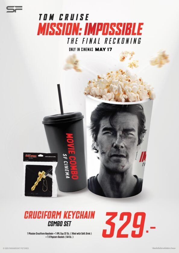 - ห้ามพลาดกับ “Mission Impossible 8 Combo Set” คอมโบเซทสุดเอ็กซ์คลูซีฟลิขสิทธิ์แท้จากภาพยนตร์ ในราคาเพียง 329 บาท ภายในเซทประกอบด้วย แก้วน้ำพร้อมน้ำอัดลมขนาด 32 ออนซ์ 1 แก้ว ถังป๊อปคอร์นขนาด 64 ออนซ์ (สามารถเลือกรสชาติป๊อปคอร์นได้) และ Mission Cruciform Keychain พวงกุญแจสุดพรีเมี่ยมลิขสิทธิ์แท้จากภาพยนตร์ วางจำหน่ายตั้งแต่วันที่ 15 พฤษภาคม 2568 เป็นต้นไปจนกว่าสินค้าจะหมด ที่โรงภาพยนตร์ในเครือ เอส เอฟ ทุกสาขาทั่วประเทศ