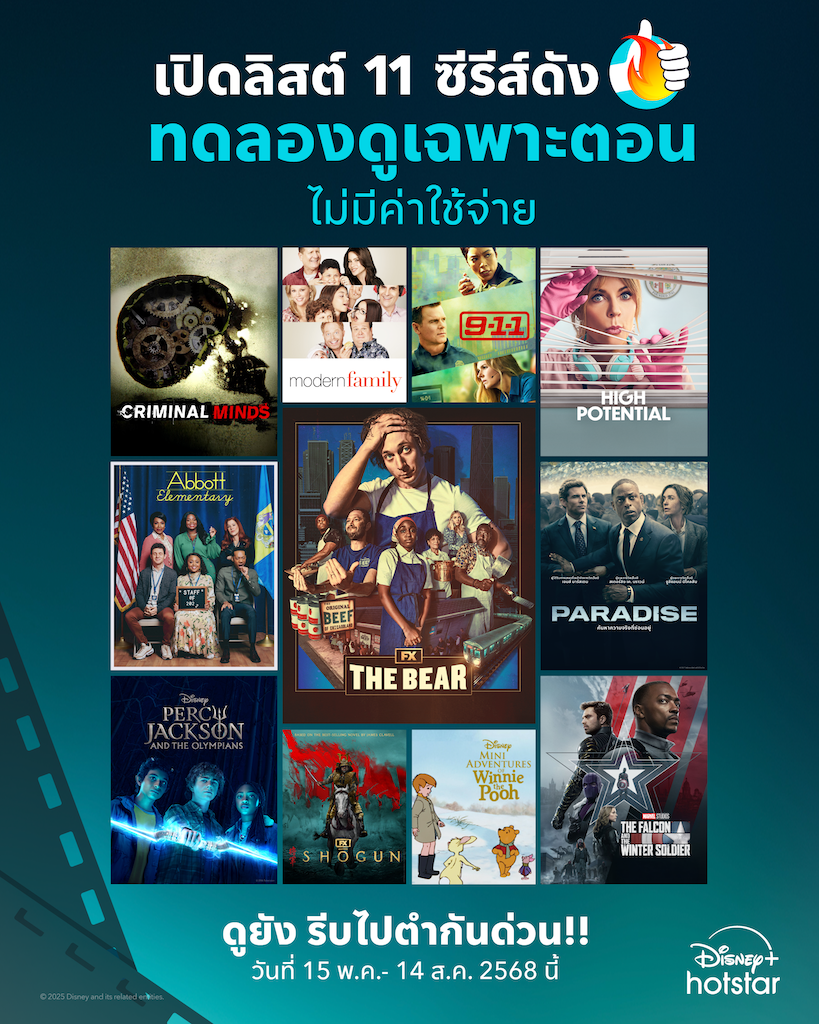 Disney+ Hotstar ส่งมอบความสนุกผ่านคอนเทนต์ระดับโลกให้คุณ “ทดลองดู เฉพาะตอน ไม่มีค่าใช้จ่าย” ขอเชิญชวนแฟน ๆ คอนเทนต์สายฮอลลิวูดมาสนุกกับ 11 ซีรีส์ดังคุณภาพคับแก้วที่เพิ่มเข้ามาใหม่ในแคมเปญทดลองดู โอกาสอันดีสำหรับผู้อยากสัมผัสประสบการณ์การสตรีมมิ่งคอนเทนท์คุณภาพและผู้ที่กำลังมองหาซีรีส์ใหม่ ๆ ได้ตั้งแต่วันที่ 15 พฤษภาคม – 14 สิงหาคม 2568 นี้ บน Disney+ Hotstar เท่านั้น