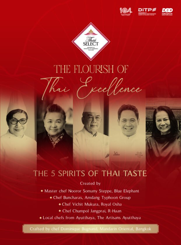ภายในงาน Thai SELECT Royal Gala Night ผู้เข้าร่วมจะได้สัมผัสความพิเศษของ ห้าจิตวิญญาณแห่งรสชาติไทย ภายใต้แนวคิด “THE 5 SPIRITS OF THAI TASTE” สะท้อนรสชาติหลักของอาหารไทย ได้แก่ เปรี้ยวหวานมันเค็มและเผ็ด ซึ่งแต่ละเมนูถูกรังสรรค์อย่างพิถีพิถันเพื่อเชิดชูแก่นแท้แห่งรสชาติอาหารไทย โดย สุดยอดเชฟจาก 5 ร้านอาหารชื่อดังในโครงการ Thai SELECT เพื่อส่งมอบประสบการณ์การลิ้มรสอาหารไทยที่น่าประทับใจ สะท้อนเสน่ห์แห่งวัฒนธรรมไทยให้ตราตรึงใจมิรู้ลืม โดยคอร์สอาหารทั้ง 5 ได้แก่ 1) The Awakening Spirit (รสเปรี้ยว) โดย BLUE ELEPHANT 2) The Grounded Spirit (รสเค็ม) โดย Amdang Typhoon Group 3) The Fiery Spirit (รสเผ็ด) โดย Royal Osha 4) The Soulful Spirit (รสมัน) โดย R-HAAN และ 5) The Nostalgic Spirit (รสหวาน) โดย The Artisans Ayutthaya