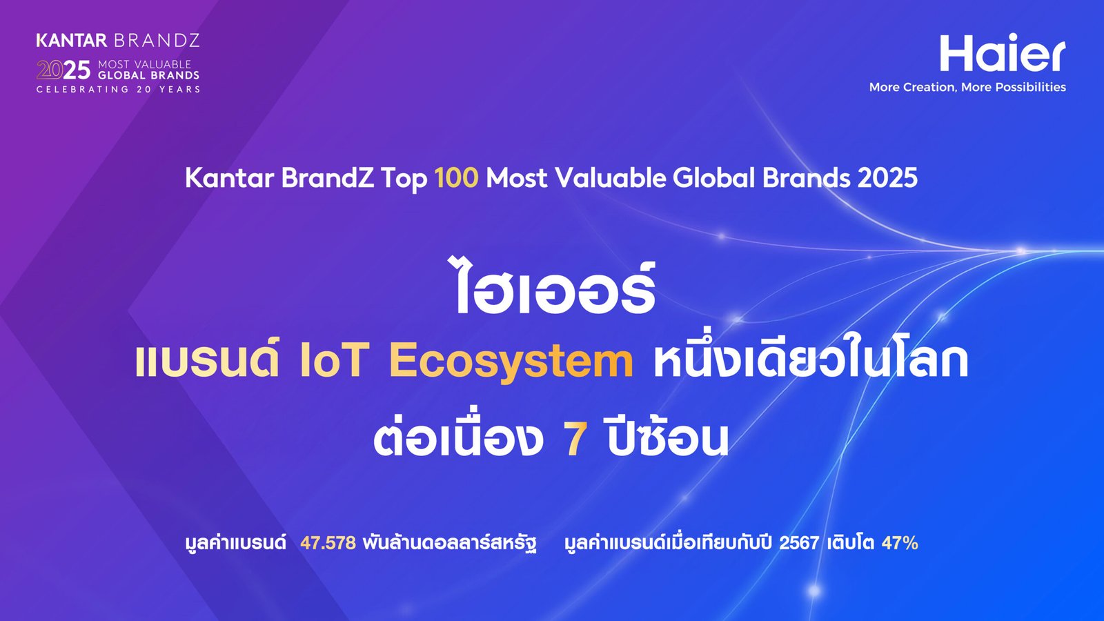 กลุ่มบริษัทไฮเออร์ (Haier Group) ประกาศความสำเร็จในเวทีระดับสากลอีกครั้งด้วยการคว้าอันดับที่ 54 ในรายงาน Kantar BrandZ Top 100 Most Valuable Global Brands ประจำปี 2025 โดยได้รับการยกย่องให้เป็นหนึ่งใน 100 แบรนด์ที่มีมูลค่าสูงที่สุดในโลก ด้วยมูลค่าแบรนด์รวมกว่า 47.6 พันล้านดอลลาร์สหรัฐ (ประมาณ 1.55 ล้านล้านบาทไทย) เพิ่มขึ้นถึง 47.1% เมื่อเทียบกับปีก่อนหน้า ความสำเร็จในครั้งนี้นับเป็นก้าวย่างสำคัญที่ตอกย้ำการเติบโตอย่างมั่นคงของไฮเออร์ในฐานะแบรนด์ระดับโลก พร้อมสะท้อนบทบาทผู้นำในฐานะแบรนด์ Ecosystem ประเภท Internet of Things (IoT) เพียงหนึ่งเดียวที่ติดอันดับโลกต่อเนื่องเป็นปีที่ 7
