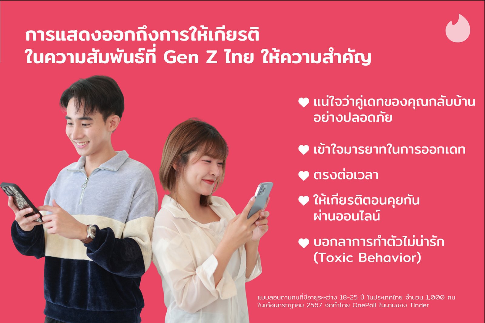 จริงๆ ไม่ได้หายไปไหน แต่มีการปรับไปกับยุคสมัยผ่านการแสดงออกผ่านการรับรู้ และเข้าใจอารมณ์ความรู้สึก ทั้งของตัวเองและอีกฝ่าย จากผลสำรวจของ TinderⓇ1 พบว่า Gen Z ไทย กำลังปรับเปลี่ยนวิธีการสร้างความสัมพันธ์แบบเดิมๆ อาทิ ไม่จำเป็นต้องแสดงความรักด้วยการจ่ายค่าอาหารแสนแพงเพื่อความประทับใจ แต่การออกเดททุกวันนี้ คนที่ทำคะแนนได้ดี คือ คนที่ให้เกียรติซึ่งกันและกัน