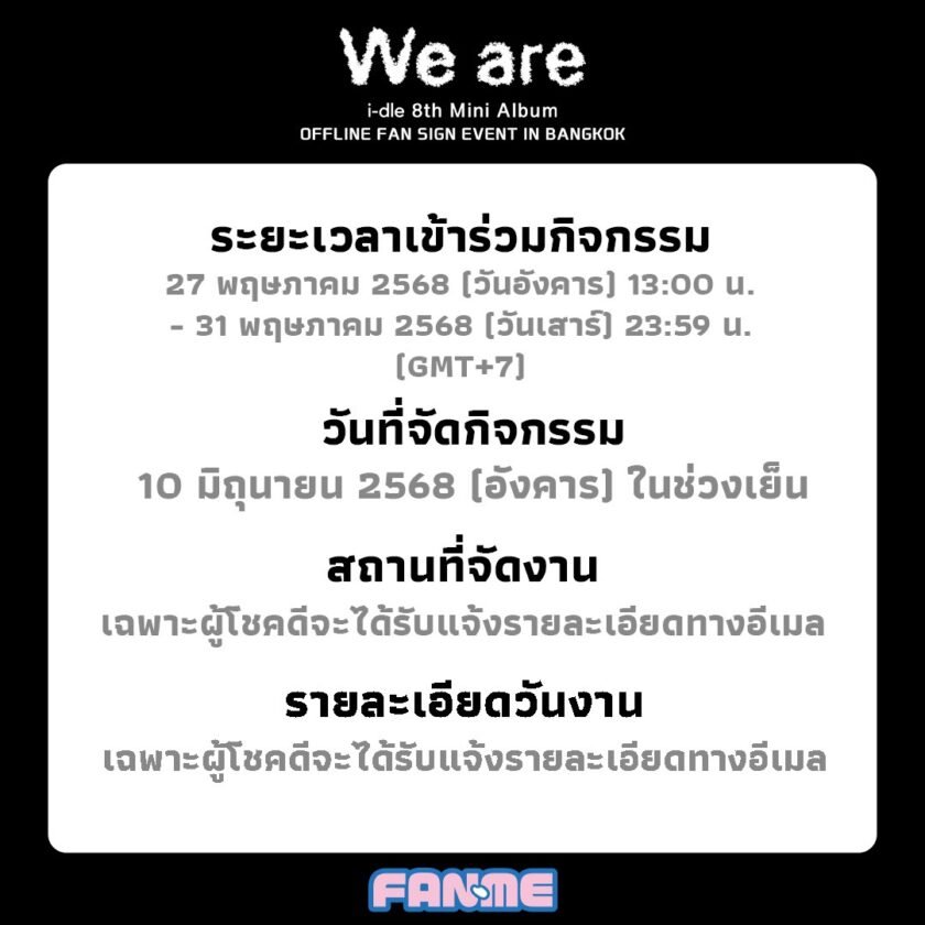 แฟนคลับชาวไทยเตรียมตัวให้พร้อม! เกิร์ลกรุ๊ปสุดฮอตแห่งยุค i-dle ประกาศจัดงานแฟนไซน์ในกรุงเทพฯ โดยผู้จัด Fanme ภายใต้ชื่องาน “i-dle 8th Mini Album OFFLINE FAN SIGN EVENT IN BANGKOK” ในวันที่ 10 มิถุนายน 2568 เพื่อฉลองการปล่อยมินิอัลบั้มชุดที่ 8 ‘We are’ ที่กำลังได้รับกระแสตอบรับอย่างล้นหลาม จากแฟนเพลงทั่วโลก และการมาพบแฟนๆ ชาวไทยในครั้งนี้ ถือเป็นอีกก้าวสำคัญที่ตอกย้ำความนิยมของพวกเธอ