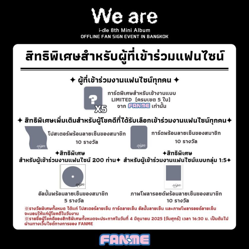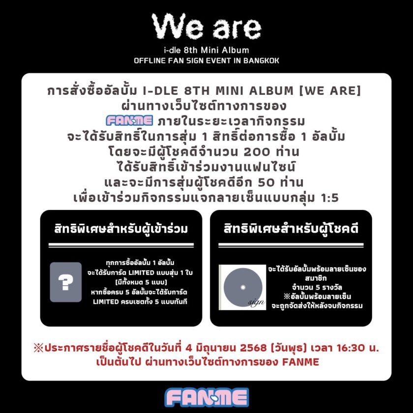 สำหรับ NEVERLAND (เนเวอร์แลนด์ : ชื่อแฟนคลับ) ที่อยากมีโอกาสใกล้ชิดกับ 5 สาว “มิยอน, มินนี่, โซยอน, อูกี” และ “ชูฮวา” แบบเอ็กซ์คลูซีฟ โอกาสดีๆ มาถึงแล้ว ร่วมลุ้นเป็นผู้โชคดีเข้าร่วมกิจกรรมแฟนไซน์กับ i-dle และลุ้นสิทธิพิเศษอีกมากมาย สามารถสั่งซื้ออัลบั้ม และเข้าร่วมกิจกรรมเพื่อลุ้นสิทธิ์ได้ตั้งแต่วันที่ 27 พฤษภาคม 2568 เวลา 13:00 น. จนถึงวันที่ 31 พฤษภาคม 2568 เวลา 23:59 น. ผ่านทาง https://fanmeofficialth.com/