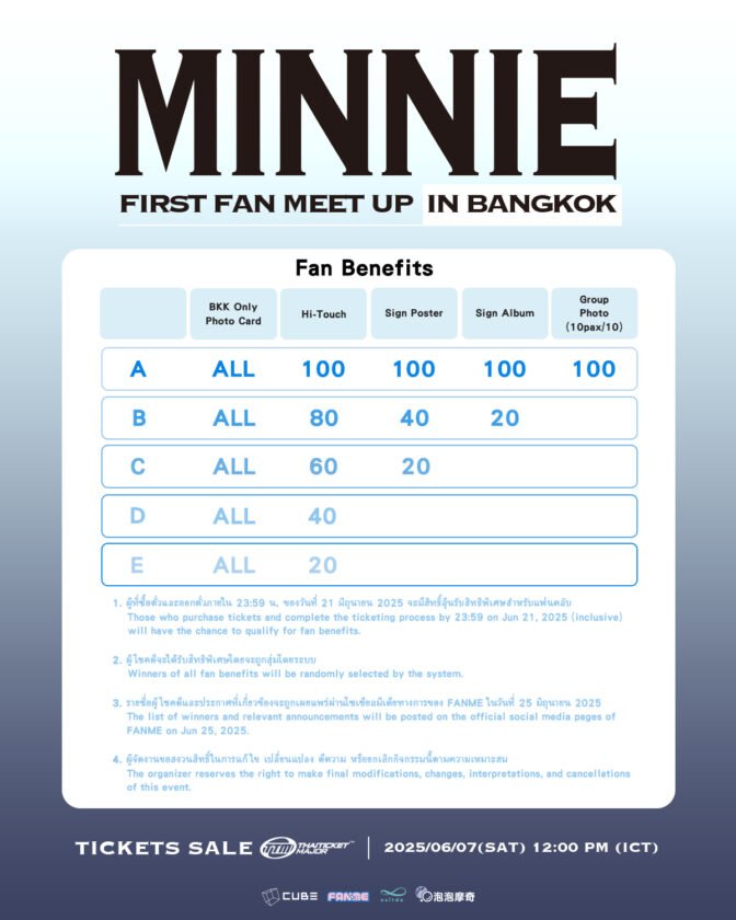 MINNIE ถือเป็นหนึ่งใน ‘แทกุกไลน์’ ที่สร้างชื่อในวงการ K-POP ได้อย่างสวยงามด้วยเสียงร้องละมุนความสามารถด้านการแต่งเพลงและคาแร็กเตอร์สดใสที่ใครก็หลงรักจนสามารถครองใจแฟนคลับทั่วโลกวันนี้ถึงเวลาแล้วที่แฟนคลับชาวไทยจะได้สัมผัสโมเมนต์สุดพิเศษที่จะอัปเลเวลความใกล้ชิดกว่าที่เคยพร้อมโชว์สุดเอ็กซ์คลูซีฟที่เตรียมมาเพื่องานนี้โดยเฉพาะรวมไปถึงร่วมลุ้นเบเนฟิตสุดฟินไม่ว่าจะเป็นลุ้น Hi-Touch , ลุ้นรับ Sign Poster , ลุ้นรับ Sign Album , ลุ้นถ่าย Group Photo และทุกที่นั่งจะได้รับ BKK Only Photo Card เก็บไว้เป็นที่ระลึกอีกด้วย
