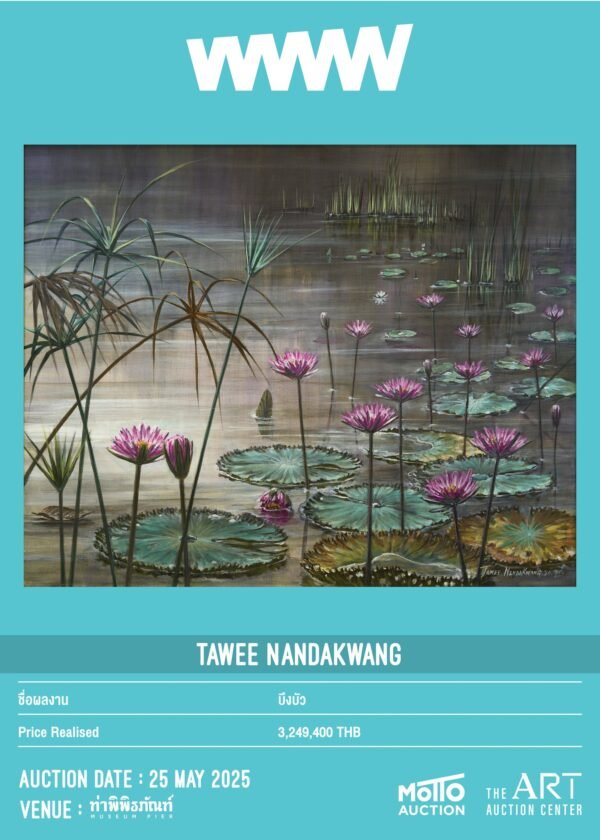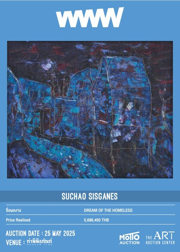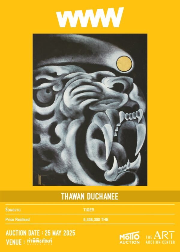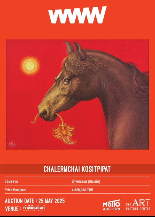 ภายในงานประมูลศิลปะ ‘WWW’ ซึ่งจัดขึ้นเมื่อวันอาทิตย์ที่ 25 พฤษภาคม 2568 ณ ท่าพิพิธภัณฑ์ เนืองแน่นไปด้วยเหล่านักสะสมและคนรักงานศิลปะทั้งชาวไทยและชาวต่างชาติ ที่เข้าร่วมการประมูลงานศิลปะกันอย่างคึกคัก ท่ามกลางเสียงปรบมือและเสียงฮือฮาที่ดังขึ้นเป็นระยะ ๆ ตลอดการประมูล โดยเฉพาะเมื่อผลงานมาสเตอร์พีชของศิลปินชั้นครูและศิลปินรุ่นใหม่ที่มีชื่อเสียงในต่างประเทศ ทำลายการประมาณราคา (Estimated Price) ได้ อย่างตื่นเต้นเร้าใจ โดย 5 ผลงานศิลปะชิ้นเยี่ยมของศิลปินไทย ที่สร้างสถิติใหม่ในงานประมูลครั้งนี้ ได้แก่