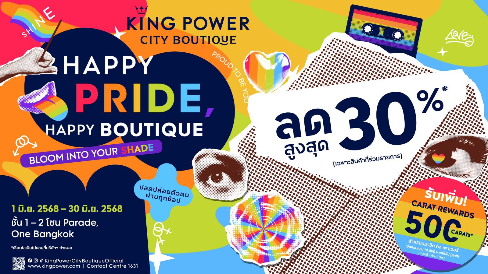 คิงเพาเวอร์ซิตีบูทีกที่สุดแห่งประสบการณ์ช้อปมิติใหม่ใจกลางเมืองจัดแคมเปญ “HAPPY PRIDE HAPPY BOUTIQUE” ฉลองเดือนแห่งสีสัน PRIDE MONTH ต้อนรับทุกตัวตนและความหลากหลาย แบบจัดเต็ม! ท่ามกลางบรรยากาศที่ตกแต่งด้วย “สีรุ้ง” สัญลักษณ์แห่งความหลากหลาย สนุกไปกับการช้อปสินค้าบิวตี้ แฟชั่นไลฟ์สไตล์ และสินค้าคอลเลคชันใหม่หมุนเวียนมาให้เลือกสรรจากแบรนด์ชั้นนำมากมาย มีไฟลต์ หรือไม่มีไฟลต์ก็ช้อปได้ รับส่วนลดสูงสุด 30% พิเศษ! สมาชิกคิงเพาเวอร์ช้อปครบ 10,000 บาทขึ้นไป (สุทธิ) (1 สิทธิ์/ท่าน/วัน) รับเพิ่ม CARAT REWARDS 500 กะรัตตลอดเดือนมิถุนายนนี้