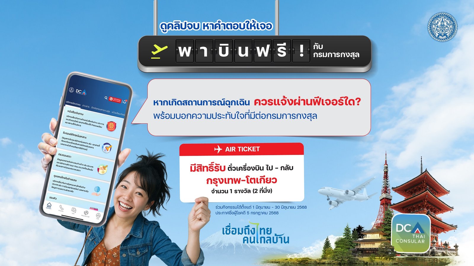 กรมการกงสุล กระทรวงการต่างประเทศ เชิญชวนร่วมกิจกรรมสุดพิเศษ “ดูคลิปจบ หาคำตอบให้เจอ พาบินลัดฟ้าฟรี! กับกรมการกงสุล” เพียงแค่ดาวน์โหลดแอปพลิเคชัน Thai Consular และร่วมตอบคำถาม บอกเล่าความประทับใจที่มีต่อกรมการกงสุล มีสิทธิ์รับตั๋วเครื่องบินไปกลับ กรุงเทพฯ – โตเกียว