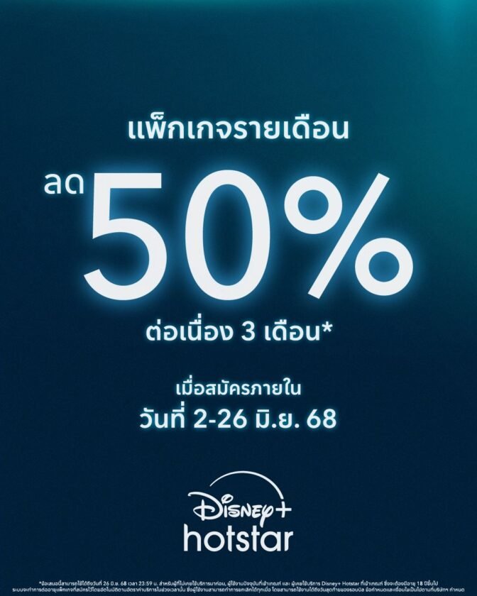 โปรโมชันพิเศษเดือนมิถุนายนนี้! Disney+ Hotstar แพ็กเกจรายเดือนลด 50% รับสิทธิ์ได้ต่อเนื่อง 3 เดือน โดยแพ็คเกจ Basic เหลือเพียง 99.50 บาทต่อเดือน และแพ็กเกจ Premium เหลือเพียง 144.50 บาทต่อเดือน สมัครได้ง่าย ๆ ทาง www.disneyplushotstar.com โดยกด “สมัครเลย” จากนั้นเลือกเข้าสู่ระบบด้วยเบอร์มือถือ (ได้ทุกเครือข่าย) ตั้งแต่วันที่ 2 – 26 มิถุนายน 2568 เวลา 23:59 น. รีบสมัครเลย แล้วมาสตรีมคอนเทนต์คุณภาพระดับโลกในราคาเพียงครึ่งเดียว