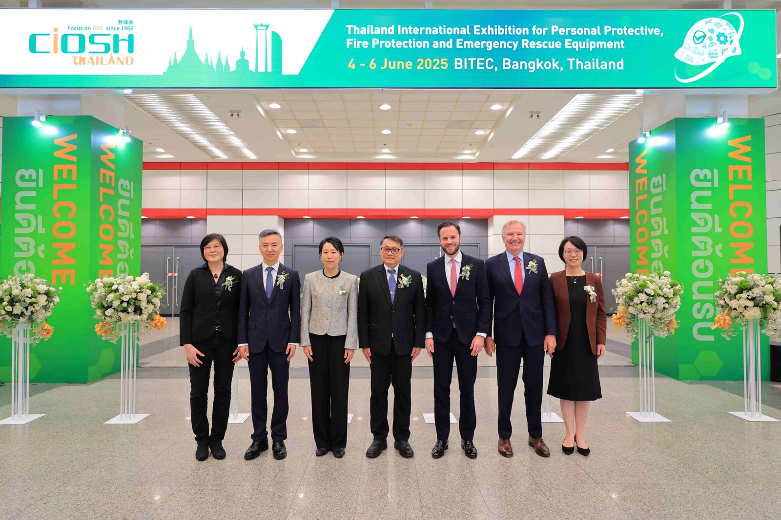 เรือเอกสาโรจน์ คมคาย อธิบดีกรมสวัสดิการและคุ้มครองแรงงาน (คนกลาง) พร้อมด้วย นางจางเซี่ยวเซี่ยว ที่ปรึกษาฝ่ายเศรษฐกิจและการพาณิชย์สถานเอกอัครราชทูตสาธารณรัฐประชาชนจีนประจำประเทศไทย (ลำดับที่ 3 จากซ้าย) นายมาริอุส แบร์เลอมันน์ ประธานเจ้าหน้าที่ฝ่ายปฏิบัติการเมสเซ่ ดุสเซลดอร์ฟ GmbH (ลำดับที่ 5 จากซ้าย) และ นายเหลยลี่หมิน ประธานสมาคมการค้าสิ่งทอแห่งประเทศจีน(ลำดับที่ 2 จากซ้าย) ร่วมเปิดงาน แสดงสินค้า CIOSH Thailand 2025 ซึ่งเป็นงานแสดงมหกรรมสินค้าด้านอุปกรณ์ป้องกันภัยส่วนบุคคล (PPE) ที่ใหญ่ที่สุดในเอเชียตะวันออกเฉียงใต้ เพื่อเป็นเวทีความร่วมมือระหว่างภาครัฐ เอกชน และพันธมิตรต่างประเทศ ในการยกระดับมาตรฐานความปลอดภัยในสถานที่ทำงานของไทยและภูมิภาค โดยกิจกรรมดังกล่าว จัดขึ้นเมื่อเร็ว ๆ นี้ ณ ศูนย์นิทรรศการและการประชุมไบเทค กรุงเทพฯ