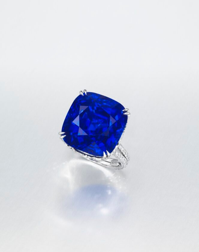 1. แหวนแซฟไฟร์ ‘The Regent Kashmir’ ทรงคุชชั่น ขนาด 35.09 กะรัต ประดับเพชร