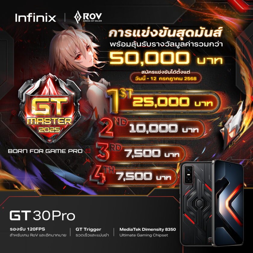 นอกจากนี้อินฟินิกซ์ยังได้เตรียมกิจกรรมสุดพิเศษไว้ให้แฟน ๆ ได้ร่วมสนุกกับทัวร์นาเมนต์การแข่งขันสุดมันส์ “Infinix GT Master 2025” การแข่งขันเกม RoV ให้กับเหล่าเกมเมอร์ได้มาพิสูจน์ฝีมือ เพื่อชิงของรางวัลมากมายมูลค่ารวมกว่า 50,000 บาท โดยเปิดรับสมัครตั้งแต่วันนี้ ถึงวันที่ 12 กรกฎาคม 2568 พร้อมกันนี้สามารถติดตามรายละเอียดกิจกรรม ข่าวสาร จากอินฟินิกซ์ได้ที่ https://www.facebook.com/InfinixMobileThailand/