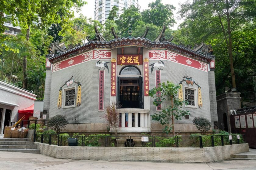 วัดหลินฟ้า ตั้งอยู่ในย่านไท่หาง เป็นวัดเล็กๆ ที่สายมูฯ ชาวไทยตัวจริงจะต้องรู้จัก คนฮ่องกงเรียกว่า “หลี่น-ฟ้า-ก๊ง” แปลว่า วังดอกบัว มีตำนานเล่าไว้ว่าครั้งหนึ่งเจ้าแม่กวนอิมเคยปรากฏกายบนก้อนหินใหญ่ที่นี่ ชาวบ้านจึงสร้างวัดบนหินก้อนนั้นเพื่อบูชาเจ้าแม่กวนอิม และให้ชื่อว่า “หินดอกบัว” ปัจจุบันหินก้อนนั้นอยู่บริเวณด้านหลังของวัด
