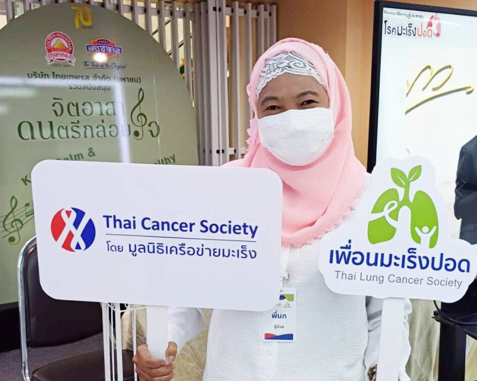 เสียงจากคุณนก ศุภาทร กัลยาณสุต ผู้ช่วยแพทย์แผนไทย และเป็นประธานชมรมผู้ป่วยมะเร็งปอด ของ TCS และอยู่ร่วมกับโรคมะเร็งปอดในฐานะผู้ป่วยมะเร็งปอดระยะ 4 ชนิด Non-small cell ปัจจุบันในวัย 56 ปีกำลังอยู่ระหว่างการรักษาด้วยยามุ่งเป้า หลังจากมะเร็งปอดกลับมาลุกลามอีกครั้ง นางศุภาทร เล่าว่า “ดิฉันเป็นคนที่ดูแลสุขภาพตัวเองดีมาตลอด ออกกำลังกายทุกวัน และตรวจสุขภาพประจำปีตามปกติ ดิฉันประเมินว่า ฝุ่นในอากาศอาจมีส่วนทำให้เป็นมะเร็ง เพราะดิฉันออกกำลังกายกลางแจ้งเป็นประจำ แม้ตอนนั้นยังไม่มีใครพูดถึง PM 2.5 ก็ตาม แต่ปัจจุบันกลายเป็นปัญหาใหญ่ที่ส่งผลต่อสุขภาพของคนไทย ดังนั้น จึงอยากแนะนำให้ทุกคนสวมหน้ากากป้องกัน เมื่อต้องเผชิญกับฝุ่นจิ๋ว นอกจากนี้ อยากส่งเสริมให้ทุกคนตรวจสุขภาพประจำปีเป็นประจำ ส่วนผู้ป่วยมะเร็งก็อยากแนะนำว่า หากยังมีวิธีรักษา ก็ควรจะรักษา เพราะตอนนี้มียาที่มีประสิทธิภาพดี ควรทานอาหารให้หลากหลาย ออกกำลังกาย และที่สำคัญ คือ อย่าหมดกำลังใจ”