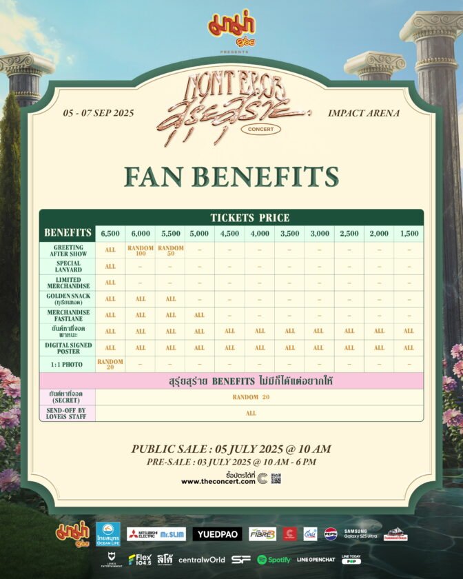 พีคไปกว่านั้นคือแพ็กเกจ NONTPAY 333 ที่เปิดโอกาสให้ทุกคนได้สัมผัสความยิ่งใหญ่ของคอนเสิร์ตนี้ด้วยงบเพียง 333 บาทเท่านั้น! แต่ความสุรุ่ยสุร่ายยังไม่หมดแค่นั้น เพราะในแพ็กเกจนี้ยังมีของขวัญพิเศษสุดเซอร์ไพรส์ที่ไม่เหมือนใคร นั่นคือ “ทุเรียนทอด”(เฉพาะราคา 6,500,6,000,5,500) ที่จะมาเพิ่มความลักชูในแบบฉบับ NONT TANONT แบบกรอบ ๆ หอม ๆ เพลินๆ ขณะดูคอนเสิร์ต และอีกหนึ่งไอเทมล้ำค่าที่สายมูต้องเลิฟ “ยันต์หาที่จอดรถ” (ทุกราคา) ที่เชื่อกันว่า เรียกชื่อ “นนท์ ธนนท์” 3 ครั้ง แล้วจะเจอที่จอดทันที!