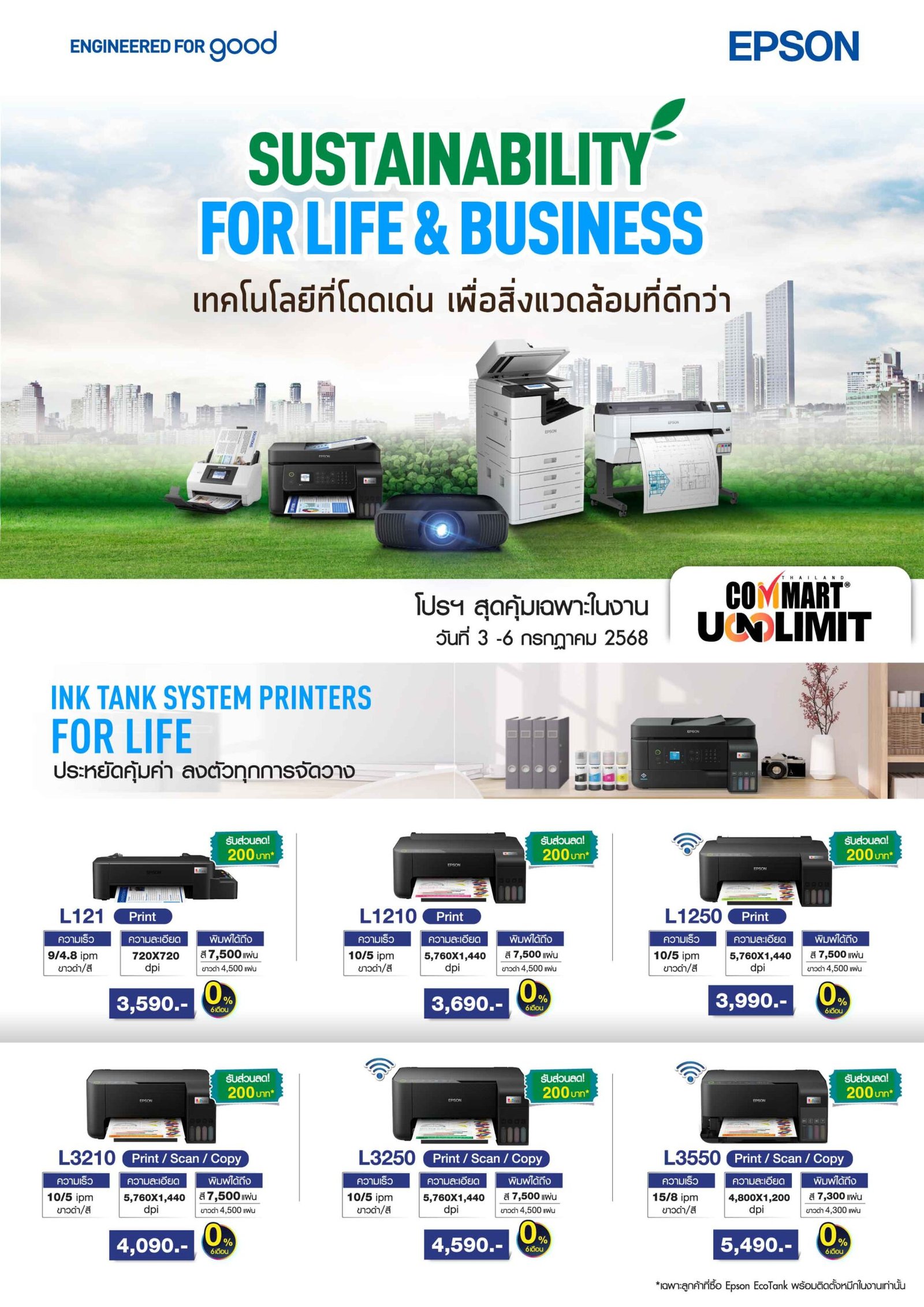 พิเศษสุด! ทุกสินค้าที่ร่วมรายการสามารถเลือกผ่อนชำระ 0% นาน 6 – 10 เดือน ตามเงื่อนไขที่กำหนด พร้อมของแถมและกิจกรรมภายในบูธอีกมากมาย ห้ามพลาด! พบกับบูธเอปสันได้ที่งาน COMMART UNLIMIT วันที่ 3 – 6 กรกฎาคมนี้ เวลา 10.00 – 21.00 น. ณ บูธ B8 ฮอลล์ EH99 ศูนย์นิทรรศการและการประชุมไบเทค