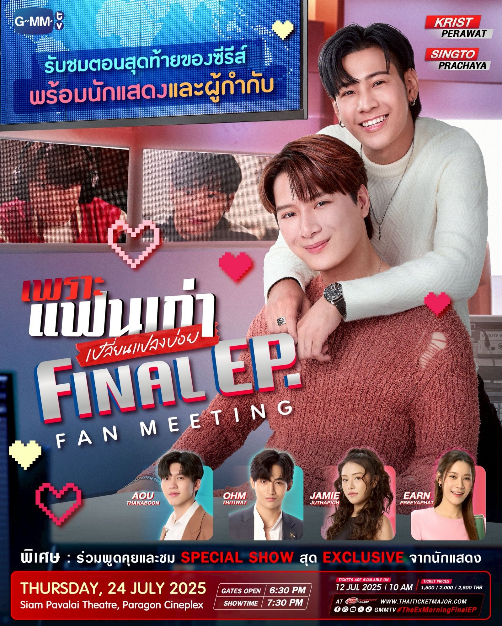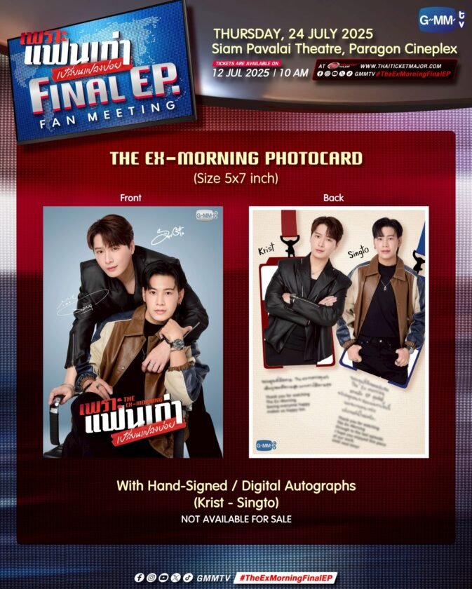 ฟินฉ่ำสมการรอคอย กับผลงานการแสดงของคู่จิ้นสุดฮอต “คริส–พีรวัส แสงโพธิรัตน์” และ “สิงโต–ปราชญา เรืองโรจน์” ที่กลับมาเล่นซีรีส์คู่กัน ถ่ายทอดความสัมพันธ์ของแฟนเก่าที่เลิกกันไปแบบโคตรแย่ รักที่เคยหวานฉ่ำ กลายเป็นความขม และต้องกลับมาทำงานร่วมกัน กับบทบาท “ปฐพี” (คริส พีรวัส) นักข่าวตัวท็อป และ “ตามตะวัน” (สิงโต ปราชญา) โปรดิวเซอร์จบนอกที่อดีตเป็นแฟนเก่า ในซีรีส์ “เพราะแฟนเก่าเปลี่ยนแปลงบ่อย The Ex-Morning” อากาศที่แปรปรวน ยังไม่เท่าแฟนเก่าที่ปรวนแปร จาก “GMMTV” ที่จับมือเสิร์ฟโมเมนต์หวานรัวๆ จนแฟนๆ อินสนั่นโซเชียล ทำให้ #TheExMorning ขึ้นเทรนด์ X “อันดับ 1” ของโลกและกระแสมาแรงติดลมบนชาร์ตตั้งแต่ EP.แรกที่ออกอากาศจนถึงตอนล่าสุด และก่อนซีรีส์จะลาจอไป “คริส–สิงโต” พร้อมด้วยพี่ๆ น้องๆ วงการข่าวตัวตึงอย่าง “อู๋–ธนบูรณ์ เกียรตินิรันดร์” รับบท “เต้” ผู้ประกาศข่าวคู่แข่งปฐพี, “เจมี่–จุฑาพิชญ์ อินทร์จันทร์” รับบท“เก๋ากี้”ช่างภาพสารคดี, “เอิร์น–ปรียาภัทย์ หล่อสุวรรณศิริ” รับบท“หนูดี” พนักงานใหม่สถานีข่าว, “โอห์ม–ฐิติวัฒน์ ฤทธิ์ประเสริฐ” รับบท “พอล” สปอนเซอร์ใหญ่ และผู้กำกับฯ คนเก่ง “ผดุงสมาจาร” ที่แท็คทีมชวนแฟนๆ มาร่วมรับชมตอนสุดท้ายของซีรีส์ และร่วมค้นหาคำตอบของถ่านไฟเก่า ที่ประทุขึ้นมาใหม่ ว่ารักครั้งนี้จะเปลี่ยนแปลงพวกเขา หรือพวกเขาจะเรียนรู้จากการเปลี่ยนแปลง…ไปด้วยกัน? ในงาน “เพราะแฟนเก่าเปลี่ยนแปลงบ่อย Final EP. FAN MEETING” ในวันพฤหัสบดีที่ 24 กรกฎาคม 2568 ตั้งแต่เวลา 17.00 น. เป็นต้นไปณ ชั้น 6 สยามพารากอน – โรงภาพยนตร์สยามภาวลัย Paragon Cineplex และเต็มอิ่มไปกับโมเมนต์ฟินจากเหล่านักแสดงด้วย Special Show สุด Exclusive และสัมภาษณ์พิเศษสุดอบอุ่น รวมถึงความสุขสนุกสนานอีกมากมายที่จะทำให้คุณใจเต้นแรงตลอดงานแน่นอน