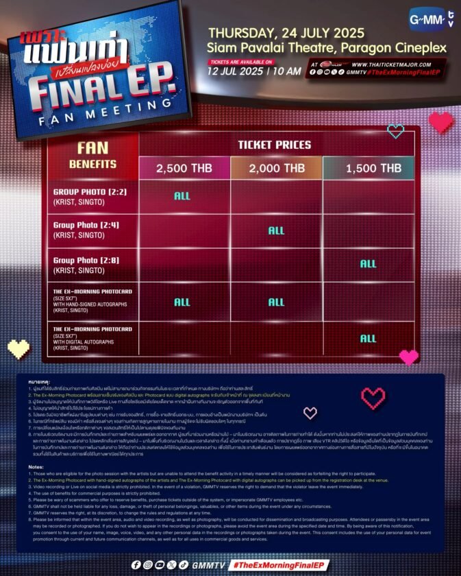 สำหรับผู้ที่สนใจสามารถจับจองบัตรเข้าร่วมงาน “เพราะแฟนเก่าเปลี่ยนแปลงบ่อย Final EP. FAN MEETING” โดยเปิดจำหน่ายบัตรในวันเสาร์ที่ 12 กรกฎาคมนี้เวลา 10.00 น. เป็นต้นไปบัตรราคา 2,500 / 2,000 / 1,500 บาทที่ไทยทิคเก็ตเมเจอร์ทุกสาขา, www.thaiticketmajor.com และ Call Center โทร 0-2262-3456 ติดตามรายละเอียดเพิ่มเติมได้ที่เว็บไซต์ : www.thaiticketmajor.com Facebook : www.facebook.com/gmmtvofficial และ Instagram & X & TikTok & YouTube & Weibo : GMMTV