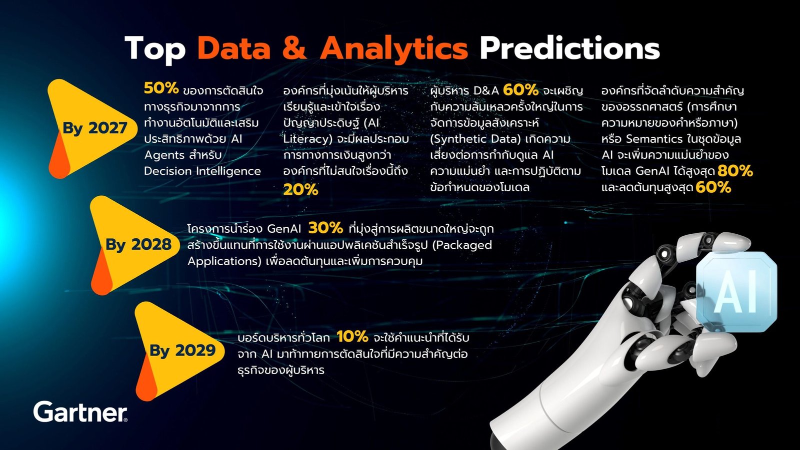 การ์ทเนอร์เผยคาดการณ์ด้านข้อมูลและการวิเคราะห์ (Data and Analytics) สำคัญ ๆ ของปี 2568 และปีต่อ ๆ ไป พบว่าการตัดสินใจทางธุรกิจครึ่งหนึ่งเป็นผลมาจากการเพิ่มประสิทธิภาพและการทำงานอัตโนมัติจาก AI Agents โดยความรู้และทักษะ AI ของผู้บริหารจะเพิ่มประสิทธิภาพทางการเงินให้สูงขึ้น และความล้มเหลวสำคัญในการจัดการข้อมูลสังเคราะห์ หรือ Synthetic Data จะเพิ่มความเสี่ยงด้านธรรมาภิบาล AI รวมถึงความแม่นยำและการปฏิบัติตามข้อกำหนดของโมเดล