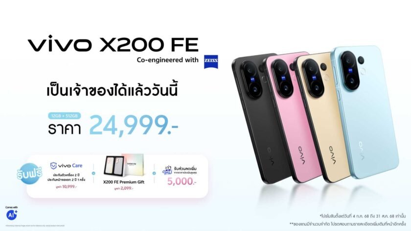 เปิดตัวพร้อมให้ผู้ใช้งานชาวไทยได้เลือกจับจองเป็นเจ้าของแล้ววันนี้ในราคา 24,999 บาทสำหรับความจุ 12GB + 512GB ที่ vivo Brand Shop ทุกสาขา ช่องทางออนไลน์ และตัวแทนจำหน่ายทั่วประเทศ พิเศษสำหรับผู้ที่สั่งซื้อภายในวันที่ 4 กรกฎาคม – 31 สิงหาคม 2568 นี้ รับของสมนาคุณมูลค่ารวมสูงสุดกว่า 13,098 บาท ได้แก่ Premium Gift Box (มูลค่า 2,099 บาท) และ vivo Care ประกันตัวเครื่อง 2 ปี และประกันหน้าจอแตก 2 ปีแรก จำนวน 1 ครั้ง (มูลค่า 10,999 บาท) นอกจากนี้ยังมีโปรโมชัน “เก่าแลกใหม่” รับส่วนลดเพิ่มจากราคาประเมินสูงสุดถึง 5,000 บาท!