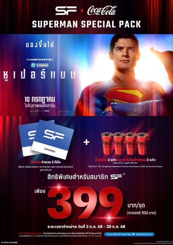 โรงภาพยนตร์ในเครือเอสเอฟ ต้อนรับการกลับมาอีกครั้งของตำนานซูเปอร์ฮีโร่ “Superman(ซูเปอร์แมน)” กับจุดเริ่มต้นครั้งใหม่จาก ดีซี สตูดิโอ โดย “เจมส์ กันน์” ที่เป็นผู้กำกับให้กับเรื่องราวของซูเปอร์ฮีโร่ต้นฉบับในจักรวาล DC สุดคุ้มกับแพ็กเกจ “SF X COKE – Superman Special Pack” ราคาพิเศษชุดละ 399 บาทภายในแพ็กประกอบด้วยสิทธิ์บัตรชมภาพยนตร์ “Superman(ซูเปอร์แมน)” จำนวน 2 ที่นั่ง (เฉพาะที่นั่ง Deluxe, Bench ทุกสาขาและที่นั่ง Premium เฉพาะสาขาเอสเอฟเวิลด์ซีเนม่า), สิทธิ์แลกน้ำอัดลมขนาด 32 OZ. จำนวน 2 แก้ว และ สิทธิ์เติมน้ำอัดลมขนาด 32 OZ. จำนวน 2 แก้วจำหน่ายที่โรงภาพยนตร์ในเครือเอสเอฟทุกสาขาทั่วประเทศตั้งแต่วันนี้เป็นต้นไปจนตลอดโปรแกรมฉายหรือจนกว่าสินค้าจะหมด