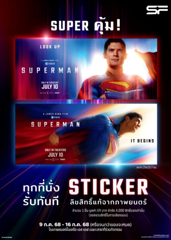 - เมื่อซื้อบัตรชมภาพยนตร์ “Superman(ซูเปอร์แมน)” รอบปกติทุกที่นั่ง (ทุกช่องทางการจำหน่าย) รับ Sticker ลิขสิทธิ์แท้จากภาพยนตร์ จำนวน 1 ชิ้น มี 2 แบบให้สะสม (ขอสงวนสิทธิ์ในการเลือกแบบ) ตั้งแต่วันที่ 9 กรกฎาคม 2568 เป็นต้นไปจนตลอดโปรแกรมฉาย หรือจนกว่าของจะหมด