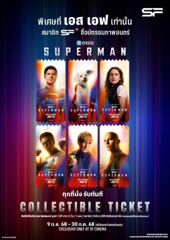 - สมาชิก SF+ ที่ซื้อบัตรชมภาพยนตร์ “Superman(ซูเปอร์แมน)” ทุกที่นั่งรับทันที SF+ Collectible Ticket ลิขสิทธิ์แท้จากภาพยนตร์ ( 1 ใบ / 1 รอบ / 1 สมาชิก ) มี 6 แบบให้สะสม ตั้งแต่วันที่ 9 กรกฎาคม 2568 เป็นต้นไปจนตลอดโปรแกรมฉาย หรือจนกว่าของจะหมด
