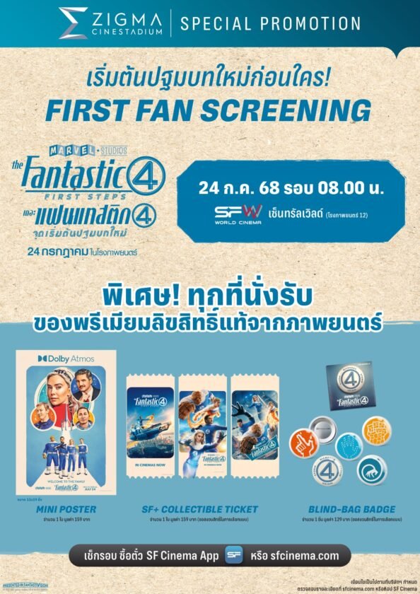 - รอบพิเศษ !! First Fan Screeningภาพยนตร์ “The Fantastic Four: First Steps (เดอะแฟนแทสติกโฟร์: จุดเริ่มต้นปฐมบทใหม่)” ซื้อบัตรชมภาพยนตร์วันที่ 24 กรกฎาคม 2568 รอบเวลา 8.00 น. กับระบบเสียงDolby Atmosและที่นั่งสบายที่สุดที่โรงภาพยนตร์ZIGMA CINESTADIUMสาขาเอสเอฟเวิลด์ซีเนม่าศูนย์การค้าเซ็นทรัลเวิลด์ในราคาเริ่มต้น 320 บาททุกที่นั่งรับของที่ระลึกลิขสิทธิ์แท้จากภาพยนตร์อาทิ Blind Bag Badge 1 ชิ้น, SF Collectible Ticket 1 ใบและมินิโปสเตอร์ ZIGMA CINESTADIUM 1 ใบ