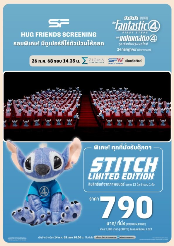 - รอบพิเศษ !! SF Hug Friends Screeningภาพยนตร์ “The Fantastic Four: First Steps (เดอะแฟนแทสติกโฟร์: จุดเริ่มต้นปฐมบทใหม่)” ซื้อบัตรชมภาพยนตร์วันที่ 26 กรกฎาคม 2568 รอบเวลา 14.35 น. ที่โรงภาพยนตร์ZIGMA CINESTADIUMสาขาเอสเอฟเวิลด์ซีเนม่าศูนย์การค้าเซ็นทรัลเวิลด์ในราคาเริ่มต้น 790 บาททุกที่นั่งรับตุ๊กตาStitch Limited Editionขนาด 12 นิ้วลิขสิทธิ์แท้จากภาพยนตร์