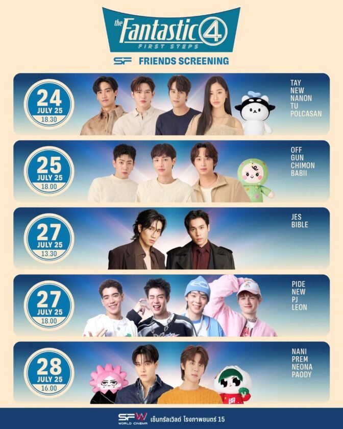 - ดูหนังพร้อมร่วมกิจกรรมกับศิลปินแบบจัดเต็มกับรอบ SF Friends Screeningภาพยนตร์ “The Fantastic Four: First Steps (เดอะแฟนแทสติกโฟร์: จุดเริ่มต้นปฐมบทใหม่)” ที่โรงภาพยนตร์ที่ 15 เอสเอฟเวิลด์ซีเนม่าศูนย์การค้าเซ็นทรัลเวิลด์ราคาที่นั่งละ 800 บาทพร้อมรับฟรีป๊อปคอร์นไซส์M 1 กล่องเปิดจำหน่ายบัตรวันที่ 21 กรกฎาคม 2568 เวลา 12.00 น. เป็นต้นไปผ่านเคาน์เตอร์เซอร์วิสในร้าน 7-Eleven และเวลา 14.00 น. ทางเว็บไซต์ALL TICKET