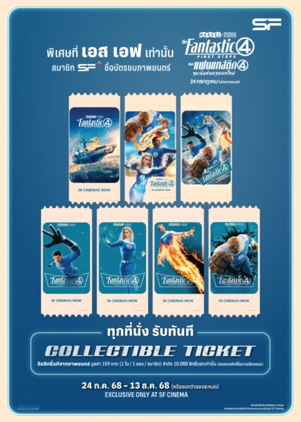 - สมาชิกSF+ที่ซื้อบัตรชมภาพยนตร์ “The Fantastic Four: First Steps (เดอะ แฟนแทสติก โฟร์: จุดเริ่มต้นปฐมบทใหม่)”ทุกที่นั่งรับทันทีSF Collectible Ticketลิขสิทธิ์แท้จากภาพยนตร์ ( 1 ใบ / 1 รอบ / 1 สมาชิก ) มี 7 แบบให้สะสมตั้งแต่ที่ 24 กรกฎาคม 2568 เป็นต้นไปจนตลอดโปรแกรมฉายหรือจนกว่าสินค้าจะหมด