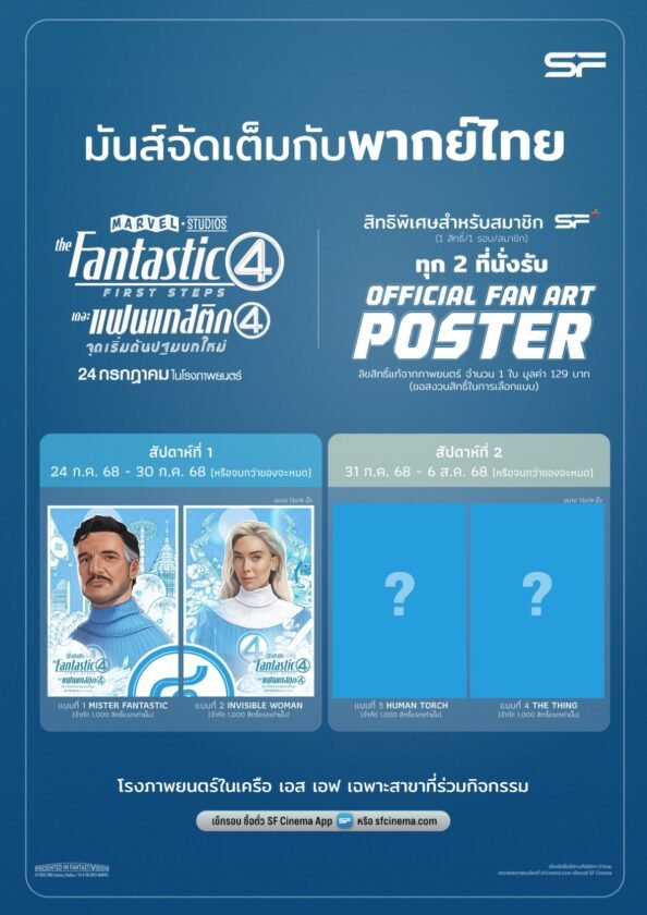 - สมาชิกSF+ที่ซื้อบัตรชมภาพยนตร์ “The Fantastic Four: First Steps (เดอะ แฟนแทสติก โฟร์: จุดเริ่มต้นปฐมบทใหม่)”โรงภาพยนตร์ปกติระบบปกติพากย์ไทยทุก 2 ที่นั่ง (ทุกช่องทางการจำหน่าย) รับออฟฟิเชียลแฟนอาร์ตโปสเตอร์ลิขสิทธิ์แท้จากภาพยนตร์จำนวน 1 ใบ ( 1 ใบ / 1 รอบ / 1 สมาชิก ) มี 4 แบบให้สะสมแบ่งแจกรายสัปดาห์ตั้งแต่ที่ 24 กรกฎาคม 2568 เป็นต้นไปจนตลอดโปรแกรมฉายหรือจนกว่าสินค้าจะหมด