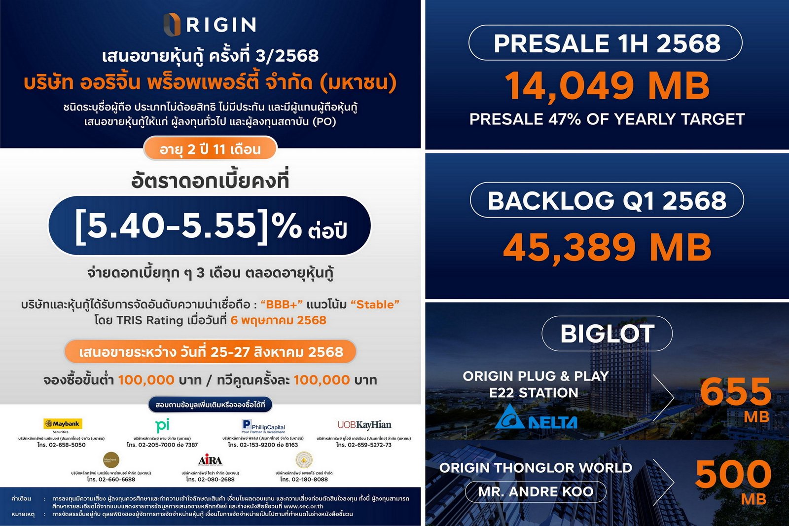 ออริจิ้นพร็อพเพอร์ตี้ยื่นไฟลิ่งเตรียมเสนอขายหุ้นกู้ครั้งที่ 3/2568 ชุดใหม่จ่ายดอกเบี้ยทุก 3 เดือนตลอดอายุหุ้นกู้อัตราดอกเบี้ย [5.40-5.55]% ต่อปีเตรียมเปิดจองวันที่ 25-27 สิงหาคม 2568 ผ่านสถาบันการเงินทั้ง 7 แห่ง