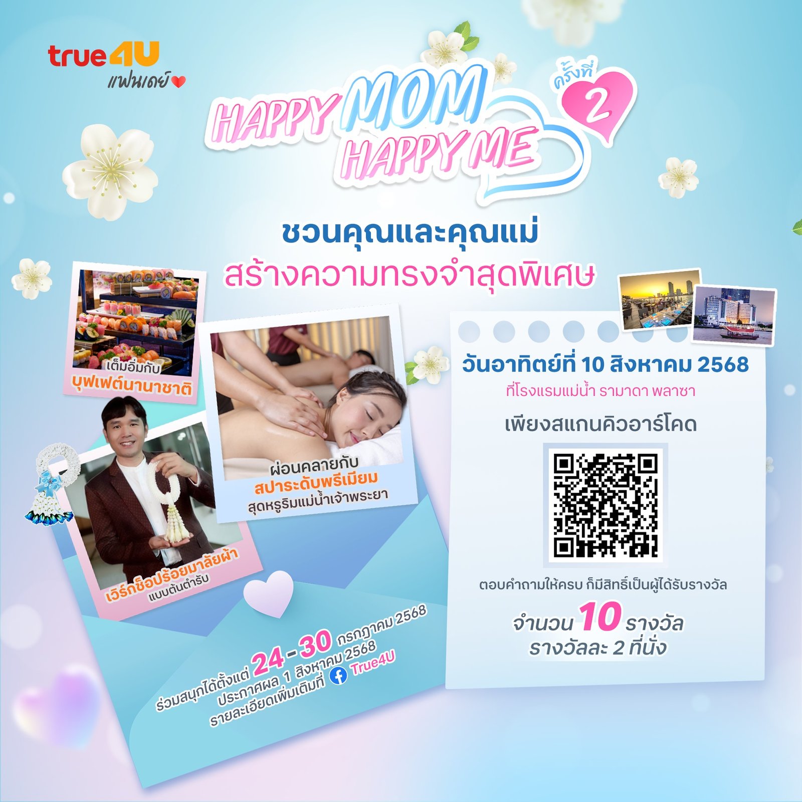 ทรูโฟร์ยู ช่อง 24 เตรียมมอบความสุขสุดอบอุ่นรับเดือนแห่งวันแม่ ด้วยกิจกรรม “True4U แฟนเดย์ Happy Mom Happy Me ครั้งที่ 2” ที่กลับมาอีกครั้งตามคำเรียกร้อง ชวนคุณลูกควงแขนคุณแม่มาสร้างความทรงจำร่วมกันอย่างใกล้ชิด ในวันอาทิตย์ที่ 10 สิงหาคม 2568 ณ โรงแรมแม่น้ำ รามาดา พลาซา
