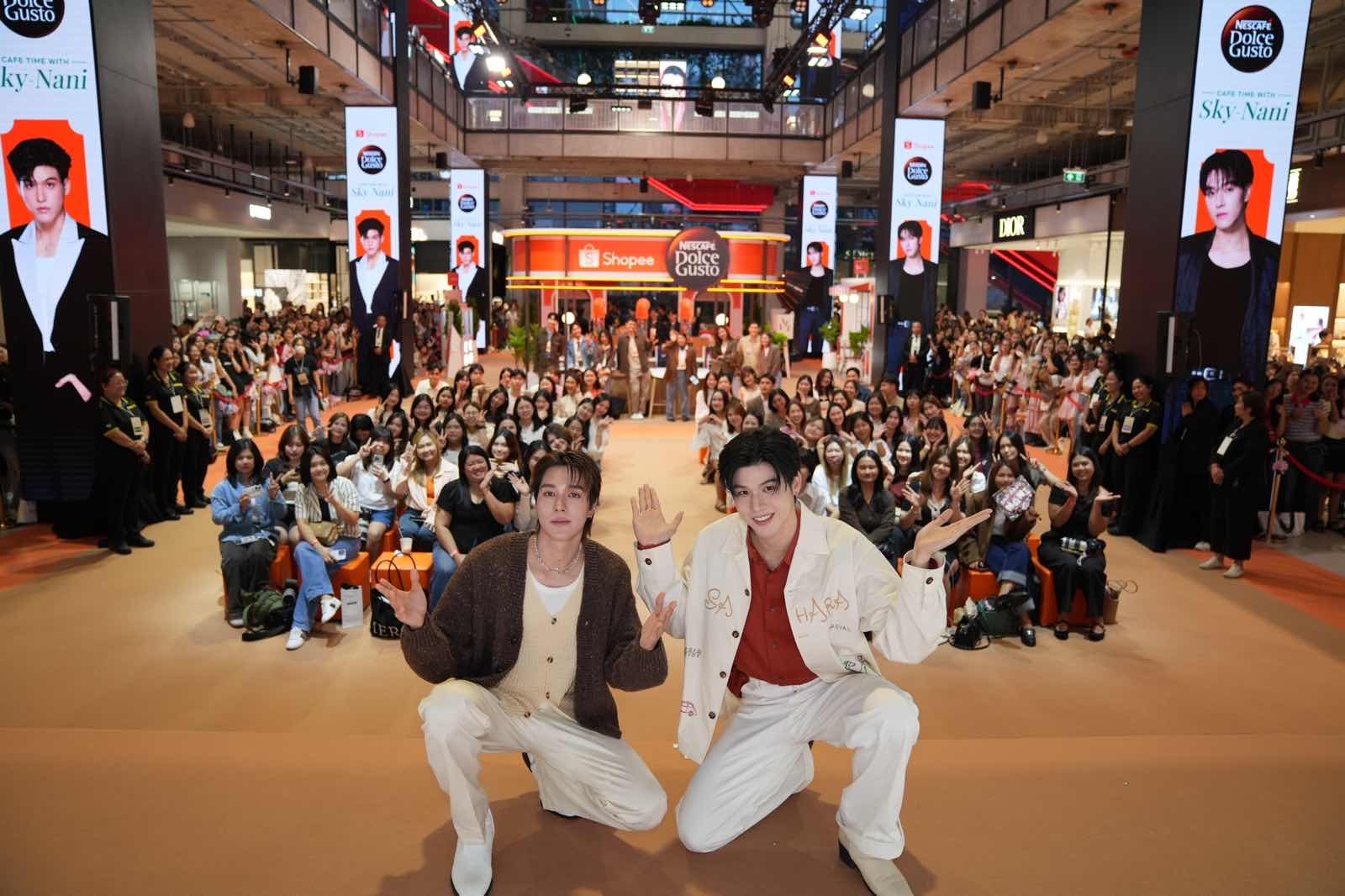 บรรยากาศภายในงาน Shopee l Dolce Gusto Cafe Time with Sky-Nani ถูก ตกแต่งขึ้นให้เสมือน เป็นมุมกาแฟที่สุดแสนจะผ่อนคลาย รายล้อมไปด้วยผลิตภัณฑ์เครื่อง ชงกาแฟและแคปซูลกาแฟ จาก เนสกาแฟ ดอลเช่ กุสโต้ ที่ช่วยเพิ่มกลิ่นอายความ รู้สึกแบบร้าน cafe Specialty โดยมีผู้โชคดีที่ได้รับสิทธิ์ทั้ง 50 ท่าน จากการร่วม กิจกรรมซื้อสินค้าที่ร่วมรายการใน Nescafe Dolce Gusto Official Shop ในช้อปปี้ มาร่วมภายในงานกันอย่างอบอุ่น ก่อนจะเริ่มต้นงานด้วยโชว์การแสดงพิเศษจาก สกาย–นานิ ที่เรียกเสียง กรี๊ดดังสนั่น จากนั้นทั้งสองหนุ่มมาร่วมพูดคุยแชร์โมเมนต์ความประทับใจ ก่อนจะเข้าสู่ช่วงไฮไลต์ที่ สกาย–นานิจะต้องครีเอทเมนูพิเศษเพื่อเป็นเป็นของขวัญ โดยใช้เครื่องชงกาแฟเนสกาแฟ ดอลเช่ กุสโต้ ที่สองหนุ่มทำกันได้แบบสะดวกสบาย งานนี้บอกเลยว่าแฟนๆ ช่วยกันชงเนสกาแฟ ดอลเช่ กุสโต้ ติดหวานแบบไม่ต้อง ใส่น้ำตาล จากนั้นก็ร่วมเล่นเกมกับผู้โชคดี พร้อมกิจกรรมแจกลายเซ็น มอบของที่ระลึก สุดน่ารักและถ่ายภาพร่วมกัน เรียกว่ามีครบทุกรสชาติแบบกลมกล่อม