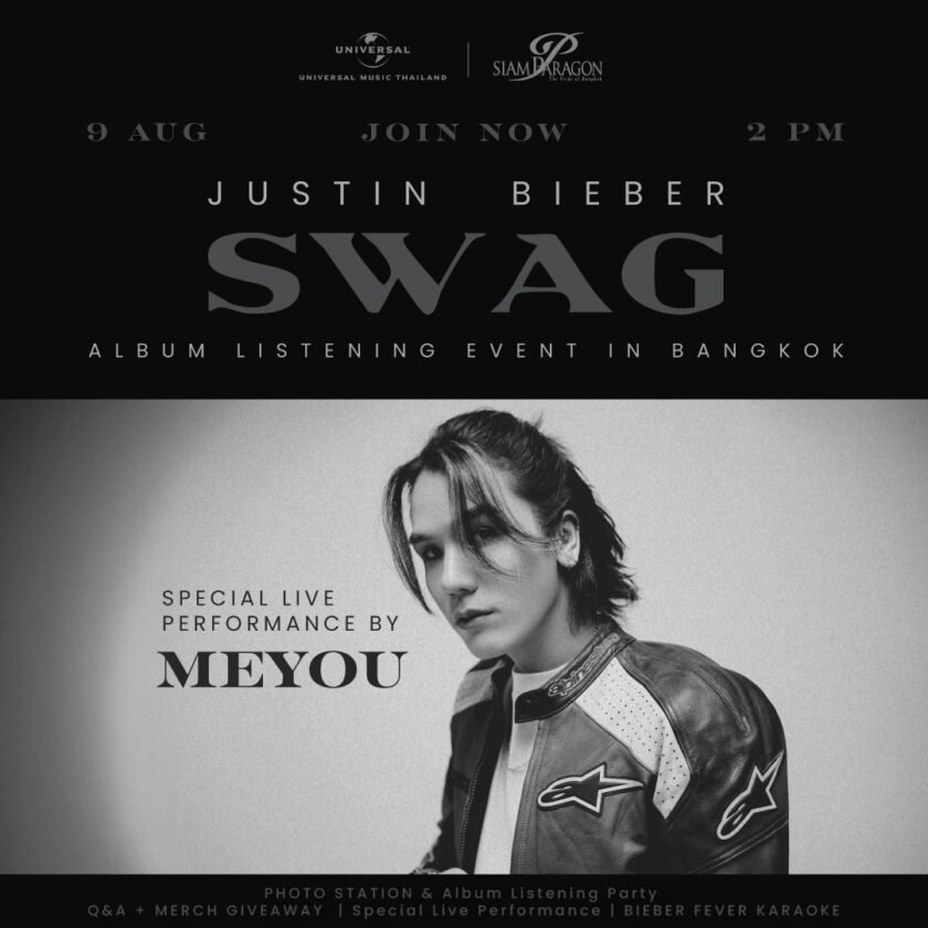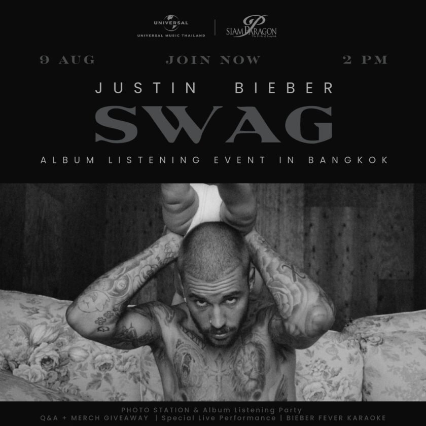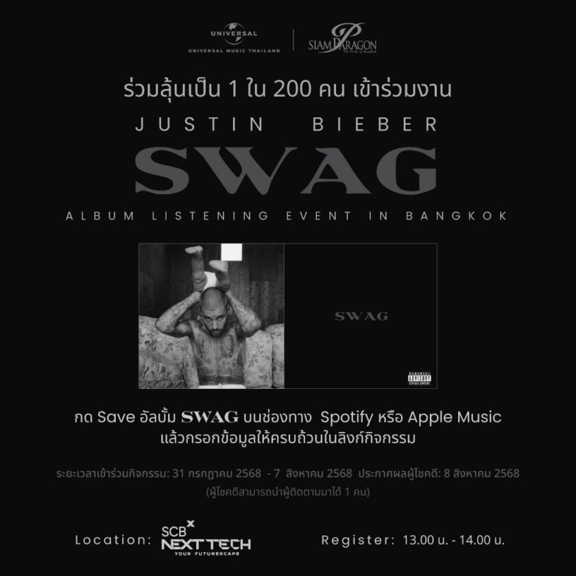 ในที่สุดเราก็ได้เจอกัน! ฉลองการกลับมาในรอบ 4 ปีของ Justin Bieber ชวนแฟน ๆ Beliebers ชาวไทย ร่วมลุ้นเป็น 1 ใน 200 ผู้โชคดีที่ได้เข้าร่วมกิจกรรมสุดพิเศษต้อนรับอัลบั้มเต็มใหม่ล่าสุด SWAG ในงาน Justin Bieber ‘SWAG’ Album Listening Event In Bangkok พร้อมด้วยกิจกรรมสุดพิเศษมากมาย ไม่ว่าจะเป็นการร่วมฟังอัลบั้มใหม่ล่าสุดจาก Justin Bieber ไปด้วยกันกับแฟน ๆ ชาวไทย หัวใจ Justin Bieber เล่นเกมตอบคำถามชิงรางวัล Official Merchandise และ เตรียมพบกับ Special Performance จาก MEYOU และปิดท้ายด้วยกิจกรรม Karaoke Party งานนี้รับรองว่าสมการรอคอย สนุกจนไม่อยากกลับบ้านกันแน่นอน