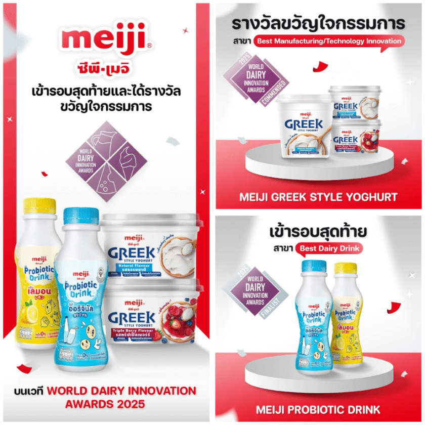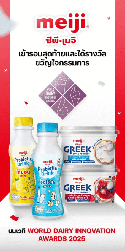 ซีพี–เมจิปังไม่หยุดส่ง 2 สินค้านวัตกรรมสู่เวที World Dairy Innovation Awards 2025 โดยสามารถเข้าสู่รอบสุดท้ายสำหรับสินค้าเมจิ–โพรไบโอติกส์ดริ้งส์เครื่องดื่มนมเพื่อความสดชื่นและคว้ารางวัลชมเชยจากสินค้าพรีเมี่ยมเมจิกรีกสไตล์โยเกิร์ตตอกย้ำความแข็งแกร่งและความเป็นผู้นำในอุตสาหกรรมผู้ผลิตเครื่องดื่มนมในประเทศไทย
