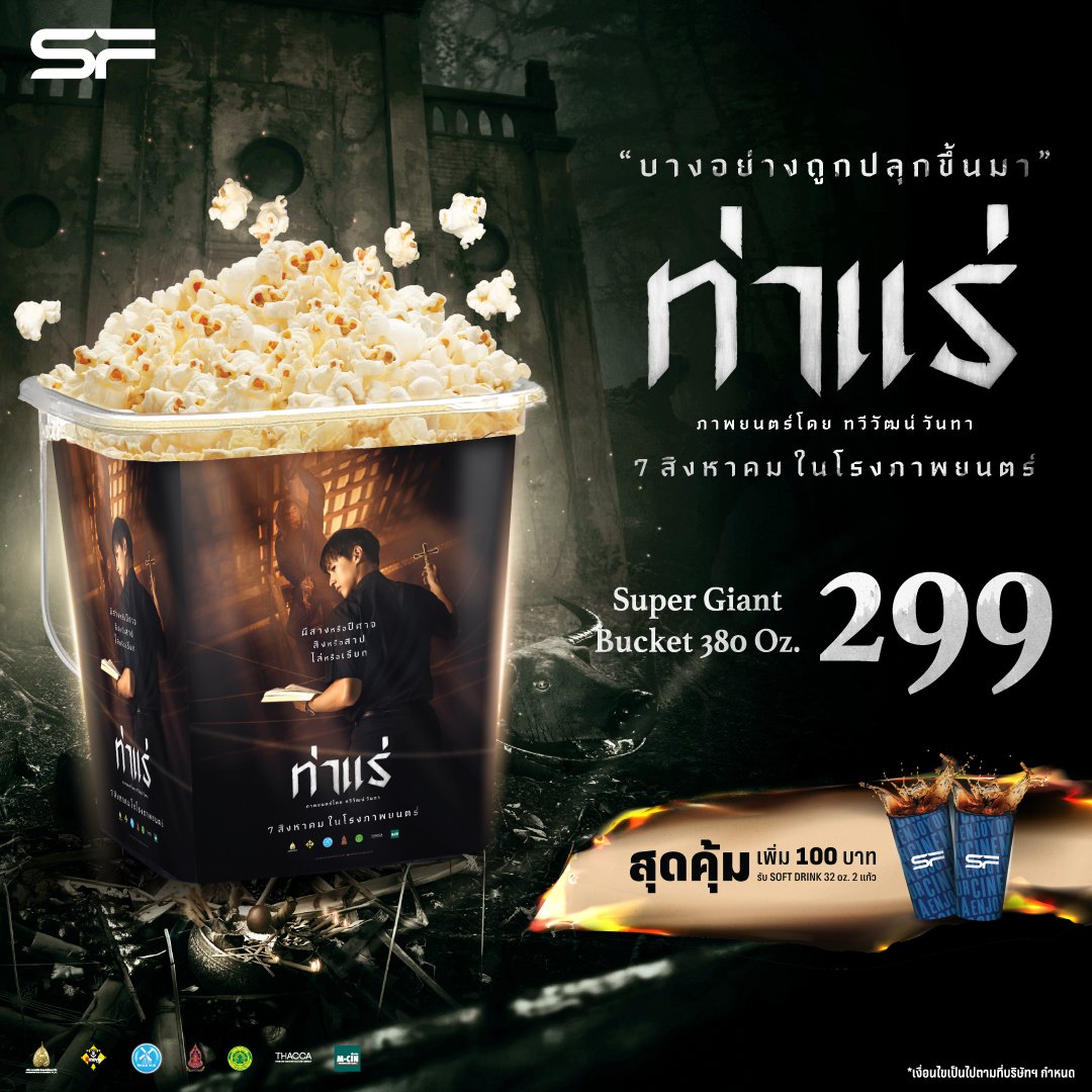 - ดูหนังพร้อมอิ่มอร่อยแบบจุใจกับ “Super Giant ท่าแร่” ถังป๊อปคอร์นยักษ์ขนาด 380 ออนซ์ ในราคาเพียง 299 บาท และ “Super Giant ท่าแร่ Combo Set” ถังป๊อปคอร์นยักษ์ขนาด 380 ออนซ์ พร้อมน้ำอัดลมขนาด 32 ออนซ์ 2 แก้ว ในราคาเพียง 399 บาท ตั้งแต่วันนี้เป็นต้นไปจนกว่าสินค้าจะหมด ที่จุดจำหน่ายป๊อปคอร์นและเครื่องดื่ม โรงภาพยนตร์ในเครือ เอส เอฟ ทุกสาขา ทั่วประเทศ