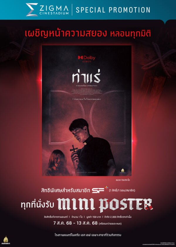 - สมาชิก SF+ ที่ซื้อบัตรชมภาพยนตร์เรื่อง “ท่าแร่” ที่โรงภาพยนตร์ ZIGMA CINESTADIUM ทุกที่นั่ง (ทุกช่องทางการจำหน่าย) รับมินิโปสเตอร์ลิขสิทธิ์แท้จากภาพยนตร์ 1 ใบ ( 1 ใบ / 1 รอบ / 1 สมาชิก ) ตั้งแต่วันที่ 7 สิงหาคม 2568 เป็นต้นไปจนตลอดโปรแกรมฉาย หรือจนกว่าสินค้าจะหมด