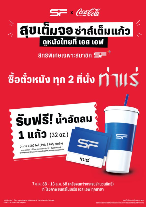 โรงภาพยนตร์ในเครือเอสเอฟ เชิญชวนทุกท่านเผชิญหน้าความสยองเกินคาดพร้อมเปิดโลกการปราบผีสุดสะพรึงของต่างขั้วศรัทธา เผชิญหน้าความสยอง ความเชื่อไหนจะขับไล่ พิธีกรรมไหนจะหยุดยั้ง กับภาพยนตร์สยองขวัญแห่งปี “ท่าแร่” คุ้มสุดกับแคมเปญ “SF X COKE สุขเต็มจอซ่าส์เต็มแก้วดูหนังไทยที่เอสเอฟ” สำหรับสมาชิก SF+ เมื่อซื้อบัตรชมภาพยนตร์ “ท่าแร่” ทุก 2 ที่นั่ง ที่โรงภาพยนตร์ในเครือ เอส เอฟ ทุกสาขาทั่วประเทศ รับฟรีน้ำอัดลม ขนาด 32 OZ. จำนวน 1 แก้ว (จำนวน 1,000 สิทธิ์ จำกัด 1สิทธิ์/สมาชิก) ตั้งแต่วันที่ 7-13 สิงหาคม 2568 จนกว่าจะครบจำนวนสิทธิ์