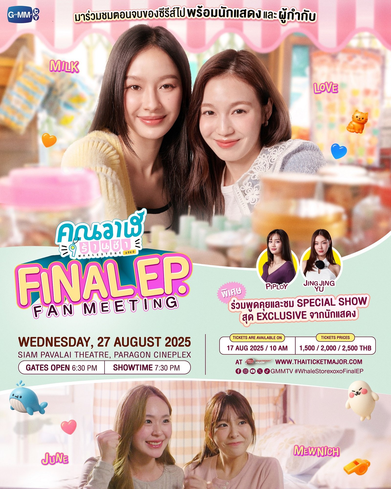 สาดโมเมนต์รักหวานฉ่ำแบบไม่มีพัก สำหรับซีรีส์ฟีลกู๊ดฮีลใจกระแสฮอต “คุณวาฬร้านชำ Whale Store xoxo” ร้านชำใกล้ใจ จะรักอะไรเพิ่มไหมคะ? จาก “GMMTV” คอนเทนต์โพรไวเดอร์ชั้นนำของเมืองไทย ที่ทำเอาแฟนๆ แห่ฟินกันสนั่นโซเชียล จนนักแสดงนำสาวสุดฮอต “มิ้ลค์–พรรษา วอสเบียน, เลิฟ–ภัทรานิษฐ์ ลิ้มปติยากร” จับมือ “จูน–วรรณวิมล เจนอัศวเมธี, มิวนิค–นันท์นภัส เลิศนามเชิดสกุล” นำทีมเพิ่มเลเวลความหวานให้แฟนๆ ใจฟูทุกโมเมนต์ ด้วยการชวนก๊วนเพื่อนมากฝีมือ “พิพลอย–กัญญรัตน์ เรืองรุ่ง, จิงจิงยู” มาร่วมเสิร์ฟความน่ารักสดใสให้ฟูลฟิลขั้นสุด พร้อมด้วยผู้กำกับคุณภาพ “สกล วงษ์สินธุ์วิเสส” ที่จะมาร่วมลุ้นทุกความสัมพันธ์ของทุกตัวแสดงและร่วมดูตอนจบซีรีส์ไปพร้อมกัน กับงาน “คุณวาฬร้านชำ Final EP. FAN MEETING” ในวันพุธที่ 27 สิงหาคม 2568 ตั้งแต่เวลา 19.30 น. เป็นต้นไปณชั้น 6 สยามพารากอนโรงภาพยนตร์สยามภาวลัย Paragon Cineplex พร้อมทั้งได้รับความสุขจาก Special Show สุด Exclusive จากนักแสดง และสัมภาษณ์พิเศษ พูดคุยถึงเบื้องลึกเบื้องหลังซีรีส์สุดอบอุ่น งานนี้แฟนๆ เตรียมล็อคคิวสัมผัสโมเมนต์ฟินแห่งปีร่วมปิดร้านชำไปพร้อมกัน