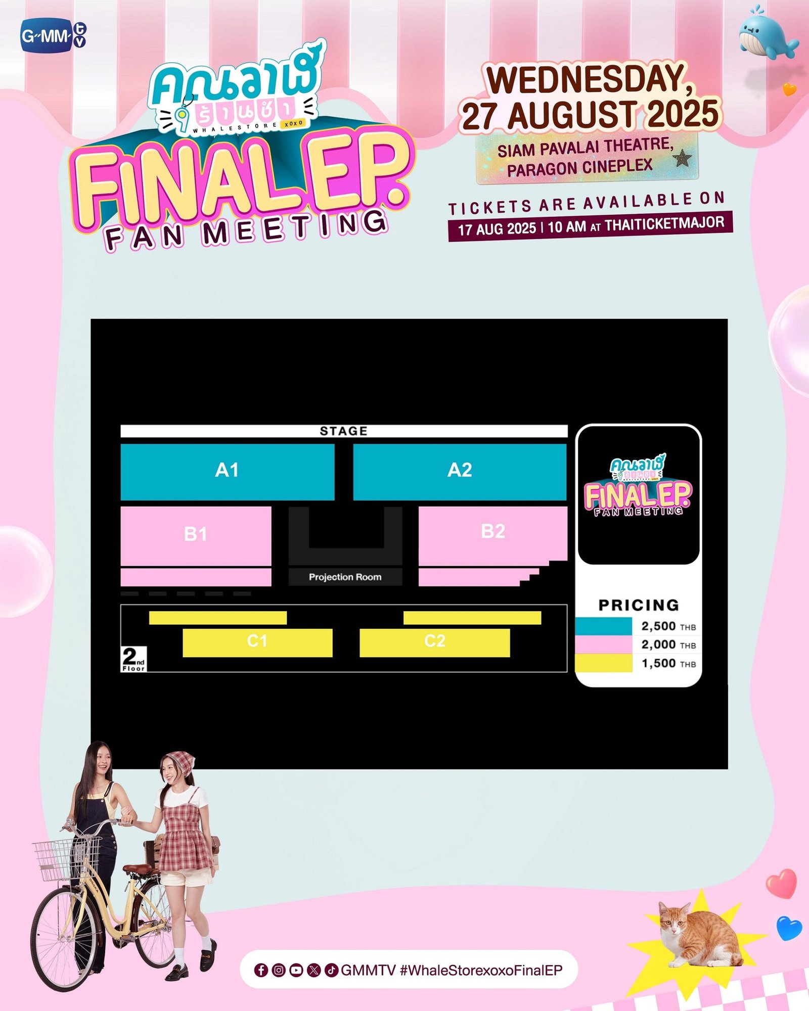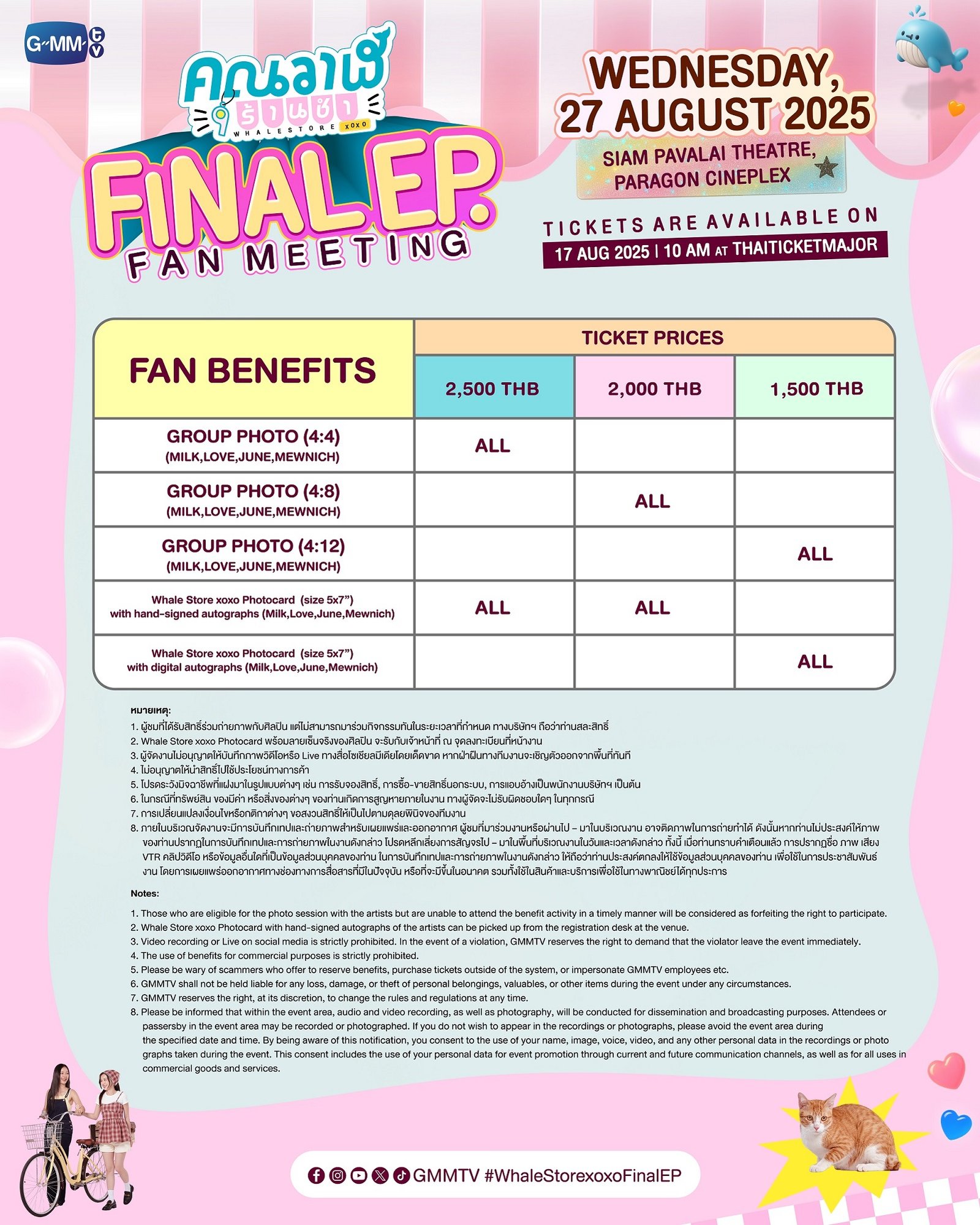 สำหรับผู้ที่สนใจสามารถจับจองบัตรเข้าร่วมงาน “คุณวาฬร้านชำ Final EP. FAN MEETING” โดยเปิดจำหน่ายบัตรในวันอาทิตย์ที่ 17 สิงหาคมนี้เริ่มเวลา 10.00 น. เป็นต้นไปบัตรราคา 2,500 / 2,000 / 1,500 บาทที่ไทยทิคเก็ตเมเจอร์ทุกสาขา, www.thaiticketmajor.com และ Call Center โทร 0-2262-3456 ติดตามรายละเอียดเพิ่มเติมได้ที่เว็บไซต์ : www.thaiticketmajor.com Facebook : www.facebook.com/gmmtvofficialและ Instagram & X & TikTok & YouTube & Weibo : GMMTV