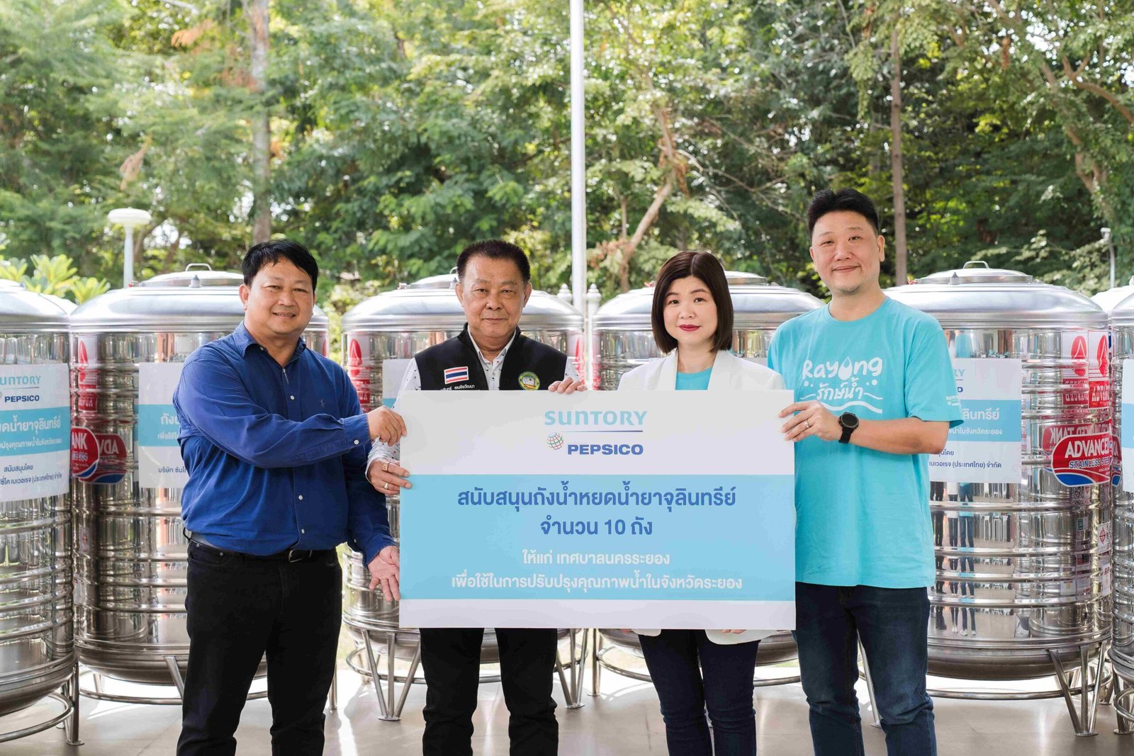บริษัท ซันโทรี่ เป๊ปซี่โค เบเวอเรจ (ประเทศไทย) จำกัดผู้ผลิตและจัดจำหน่ายเครื่องดื่มภายใต้แบรนด์สินค้าของซันโทรี่และเป๊ปซี่โคในประเทศไทยนำโดย นายรัฐวุฒิงามวุฒิวงศ์รองประธานบริหารฝ่ายการผลิตโรงงานจังหวัดระยอง (ที่ 4 จากซ้าย) พร้อมด้วย นางสาววิภาวรรณทัศนปรีชาชัยรองประธานบริหารฝ่ายบรรษัทสัมพันธ์ (ที่ 3 จากซ้าย) เดินหน้าสานต่อพันธกิจด้านการอนุรักษ์ทรัพยากรน้ำอย่างยั่งยืน ผ่านโครงการ “ระยองรักษ์น้ำ” ของบริษัทฯ ด้วยการสนับสนุนถังหยดน้ำยาจุลินทรีย์ขนาด 1,000 ลิตร จำนวน 10 ถัง ให้แก่เทศบาลนครระยองต่อเนื่องเป็นปีที่สอง เพื่อใช้ขยายผลการแก้ไขปัญหามลพิษทางน้ำและปรับปรุงคุณภาพน้ำที่เสื่อมโทรมในเขตเทศบาลนครระยอง โดยมี นายนรินทร์เจนจิรวัฒนารองนายกเทศมนตรีนครระยอง (ที่ 2 จากซ้าย) และนายชญชมปลื้มวุฒิวัฒน์หัวหน้าฝ่ายจัดการคุณภาพน้ำเทศบาลนครระยอง (ที่ 1 จากซ้าย) เป็นผู้รับมอบ ณ ศูนย์บริหารจัดการคุณภาพน้ำเทศบาลนครระยอง จังหวัดระยอง