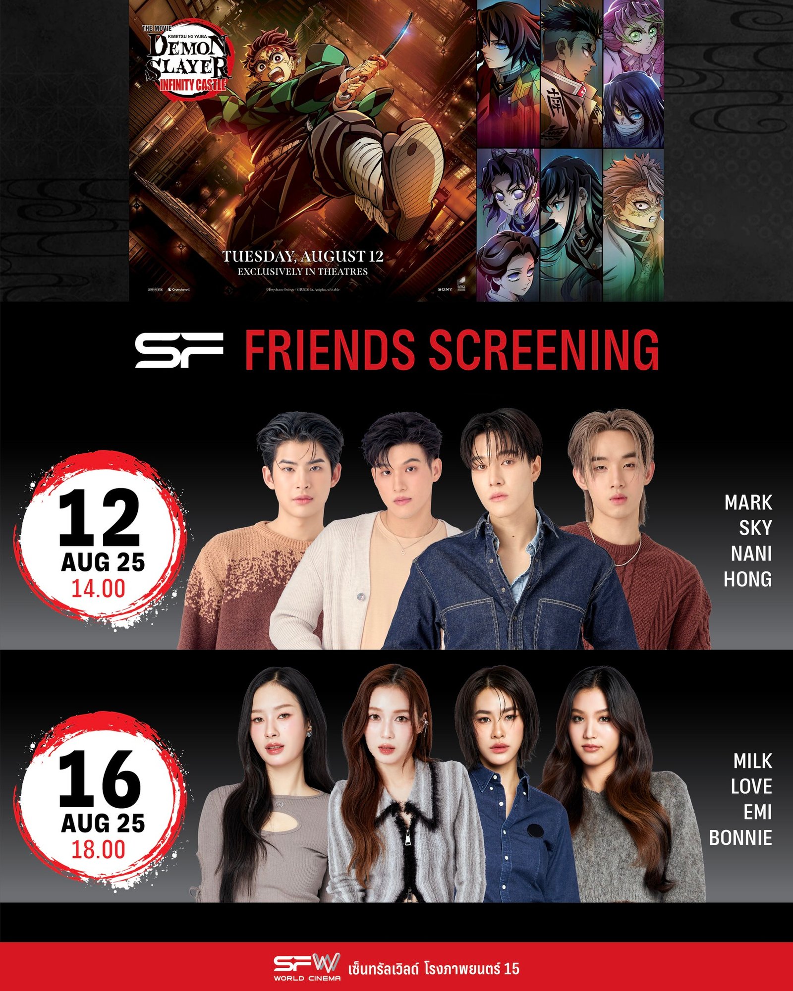 - ดูหนังพร้อมร่วมกิจกรรมกับศิลปินแบบจัดเต็มกับรอบ SF Friends Screeningภาพยนตร์ “ดาบพิฆาตอสูรเดอะมูฟวี่: ศึกปราสาทไร้ขอบเขตองก์ที่ 1 : การกลับมาของอาคาสะ” ที่โรงภาพยนตร์ที่ 15 เอสเอฟเวิลด์ซีเนม่าศูนย์การค้าเซ็นทรัลเวิลด์ราคาที่นั่งละ 800 บาทพร้อมรับฟรีป๊อปคอร์นไซส์M 1 กล่องเปิดจำหน่ายบัตรวันที่ 9 สิงหาคม 2568 เวลา 11.00 น. เป็นต้นไปผ่านเคาน์เตอร์เซอร์วิสในร้าน 7-Elevenและเวลา 13.00 น. ทางเว็บไซต์ALL TICKET